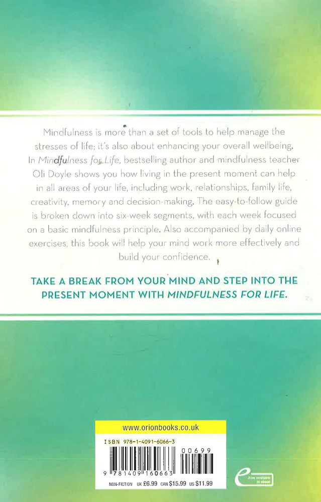 Mindfulness is more than a set of tools to help manage the stresses of life; it's also about enhancing your overall wellbeing. In MINDFULNESS FOR LIFE, mindfulness teacher Oli Doyle shows you how living in the present moment can help in all areas of your life, including work, relationships, family life, creativity, memory and decision-making. Unlike many mindfulness books, Oli deconstructs the practice into everyday language. The easy-to-follow plan is broken down into six-week segments, with each week focused on a basic mindfulness principle. This book is also accompanied by daily online exercises to help your mind work more effectively and build your confidence.
