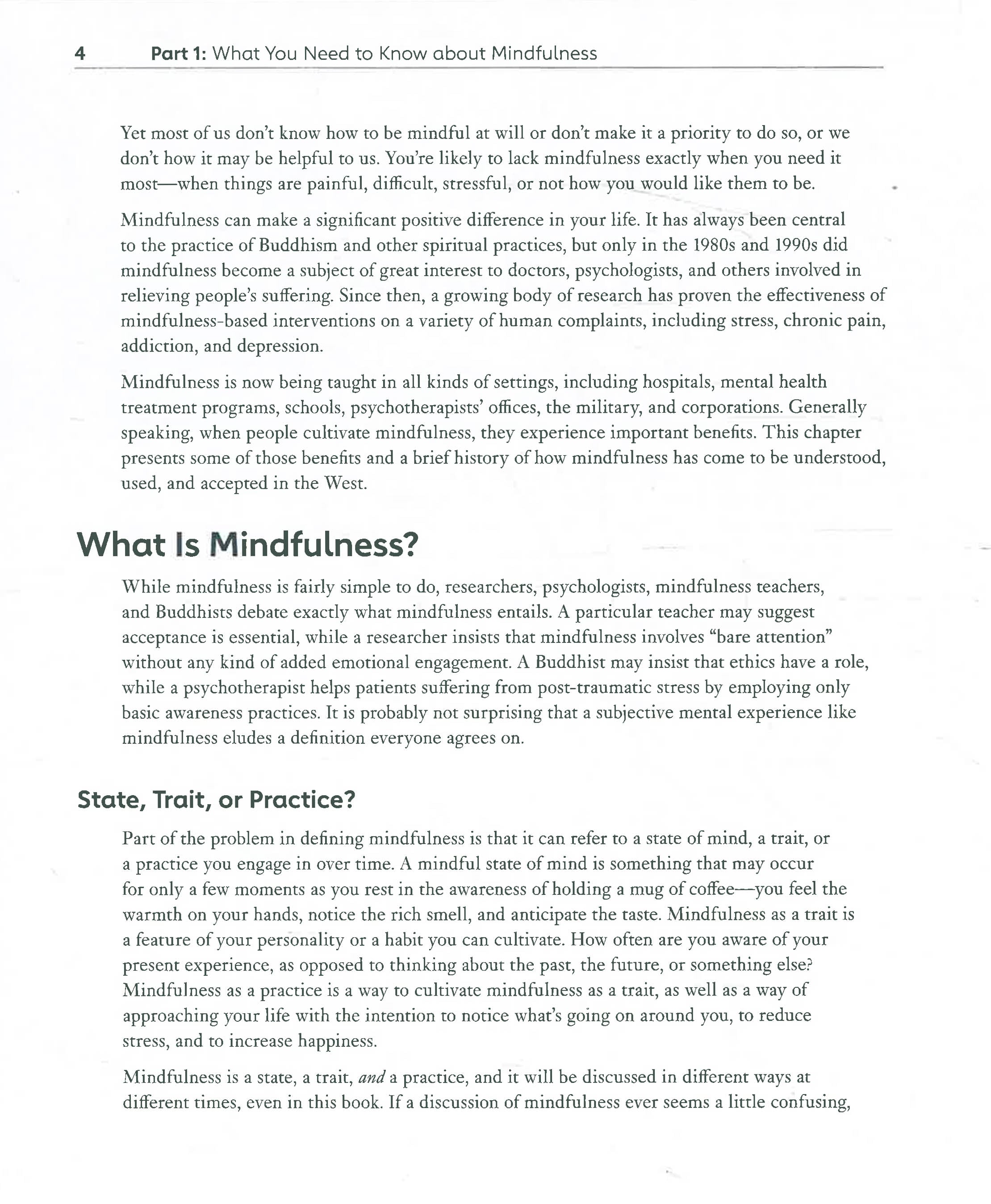 With regular practice, use the mindfulness meditations in this guidebook to learn to be more conscious of and attentive to your body, feelings, and patterns of thought. Doing so will lead to greater knowledge and understanding of yourself. Better yet, the positive effects of regular mindfulness are easy to achieve!