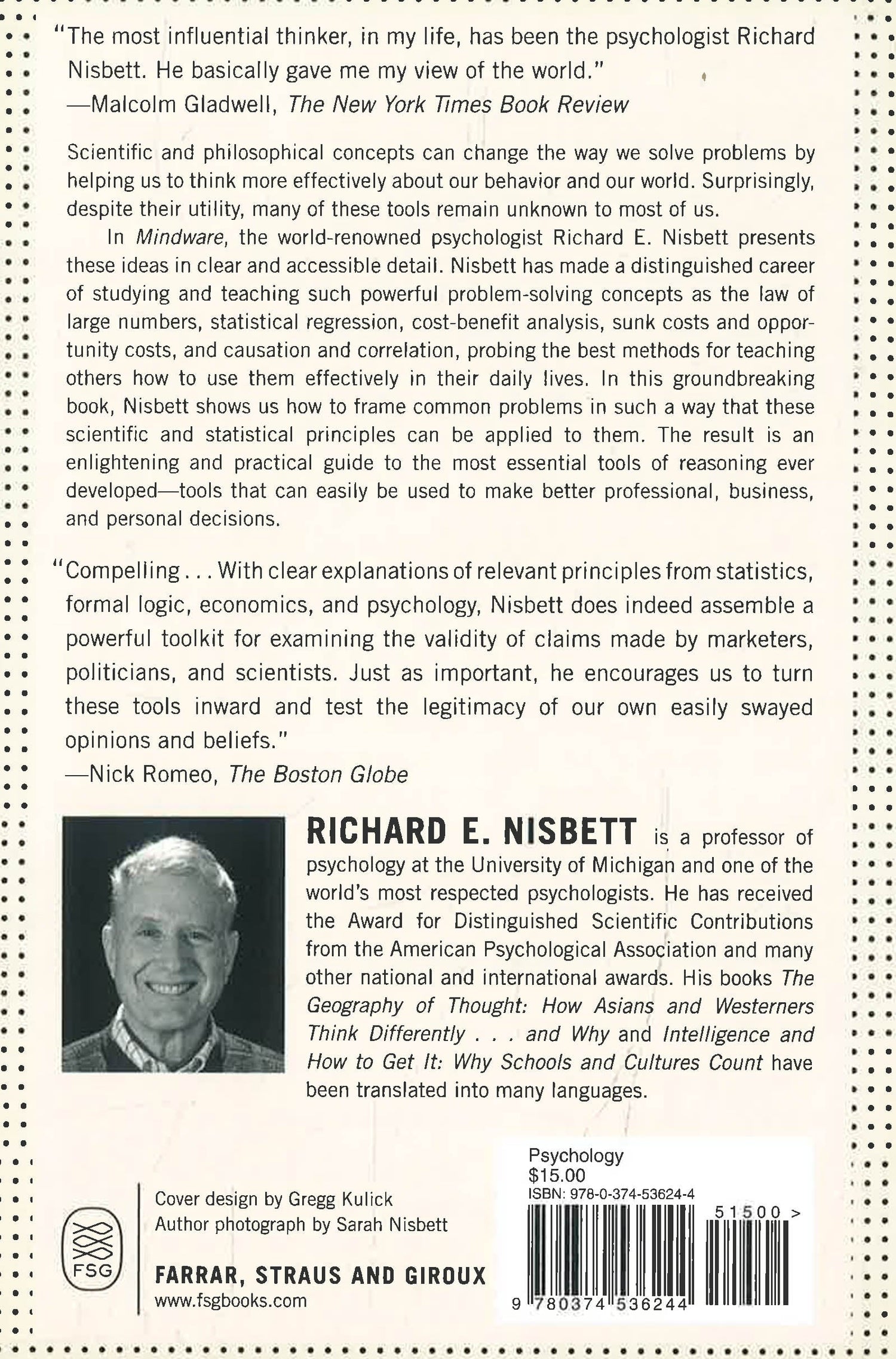 In Mindware, the world-renowned psychologist Richard E. Nisbett presents these ideas in clear and accessible detail, offering a tool kit for better thinking and wiser decisions. He has made a distinguished career of studying and teaching such powerful problem-solving concepts as the law of large numbers, statistical regression, cost-benefit analysis, sunk costs and opportunity costs, and causation and correlation, probing how best to teach others to use them effectively in their daily lives. In this groundbreaking book, he shows that a course in a given field--statistics or economics, for example--often doesn't work as well as a few minutes of more practical instruction in analyzing everyday situations. Mindware shows how to reframe common problems in such a way that these powerful scientific and statistical concepts can be applied to them. The result is an enlightening and practical guide to the most powerful tools of reasoning ever developed--tools that can easily be used to make better professional, business, and personal decisions.