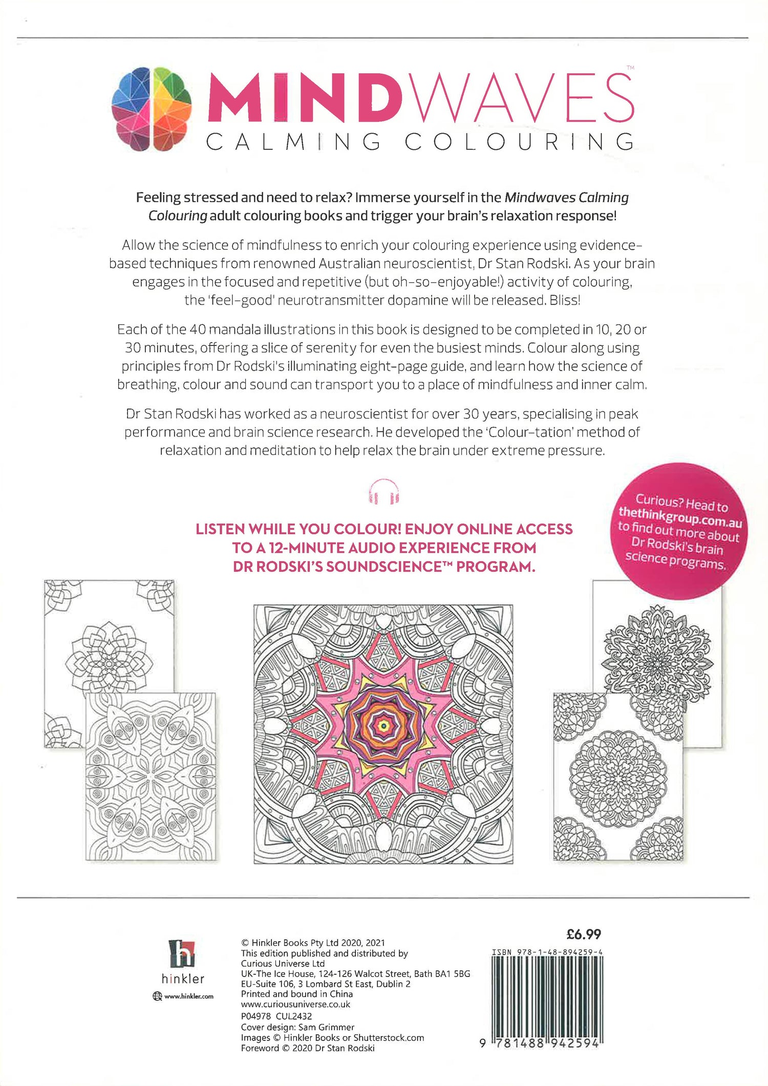 Featuring 40 beautiful colouring pages that can be completed in 10, 20 or 30 minutes, Mandalas offers a dose of creative calm for even the busiest minds. Plus, use the code included to enjoy online access to Dr Rodski's Soundscience (TM) program and enhance your colouring experience with the power of sound.