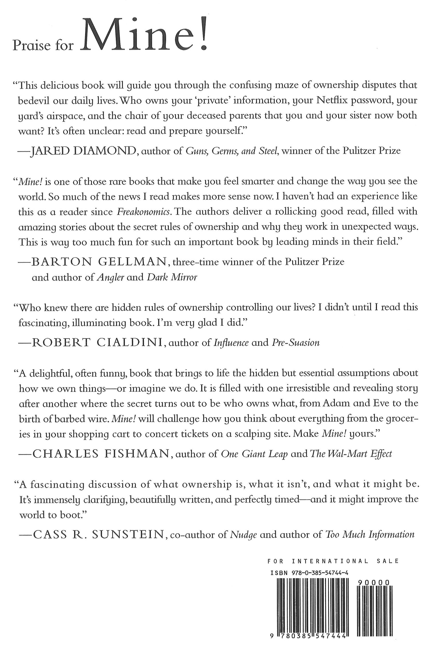 A hidden set of rules governs who owns what—explaining everything from whether you can recline your airplane seat to why HBO lets you borrow a password illegally—and in this lively and entertaining guide, two acclaimed law professors reveal how things become "mine." "Mine" is one of the first words babies learn. By the time we grow up, the idea of ownership seems natural, whether buying a cup of coffee or a house. But who controls the space behind your airplane seat: you reclining or the squished laptop user behind? Why is plagiarism wrong, but it's okay to knock-off a recipe or a dress design? And after a snowstorm, why does a chair in the street hold your parking space in Chicago, but in New York you lose the space and the chair? Mine! explains these puzzles and many more. Surprisingly, there are just six simple stories that everyone uses to claim everything. Owners choose the story that steers us to do what they want. But we can always pick a different story. This is true not just for airplane seats, but also for battles over digital privacy, climate change, and wealth inequality. As Michael Heller and James Salzman show—in the spirited style of Freakonomics, Nudge, and Predictably Irrational—ownership is always up for grabs. With stories that are eye-opening, mind-bending, and sometimes infuriating, Mine! reveals the rules of ownership that secretly control our lives.