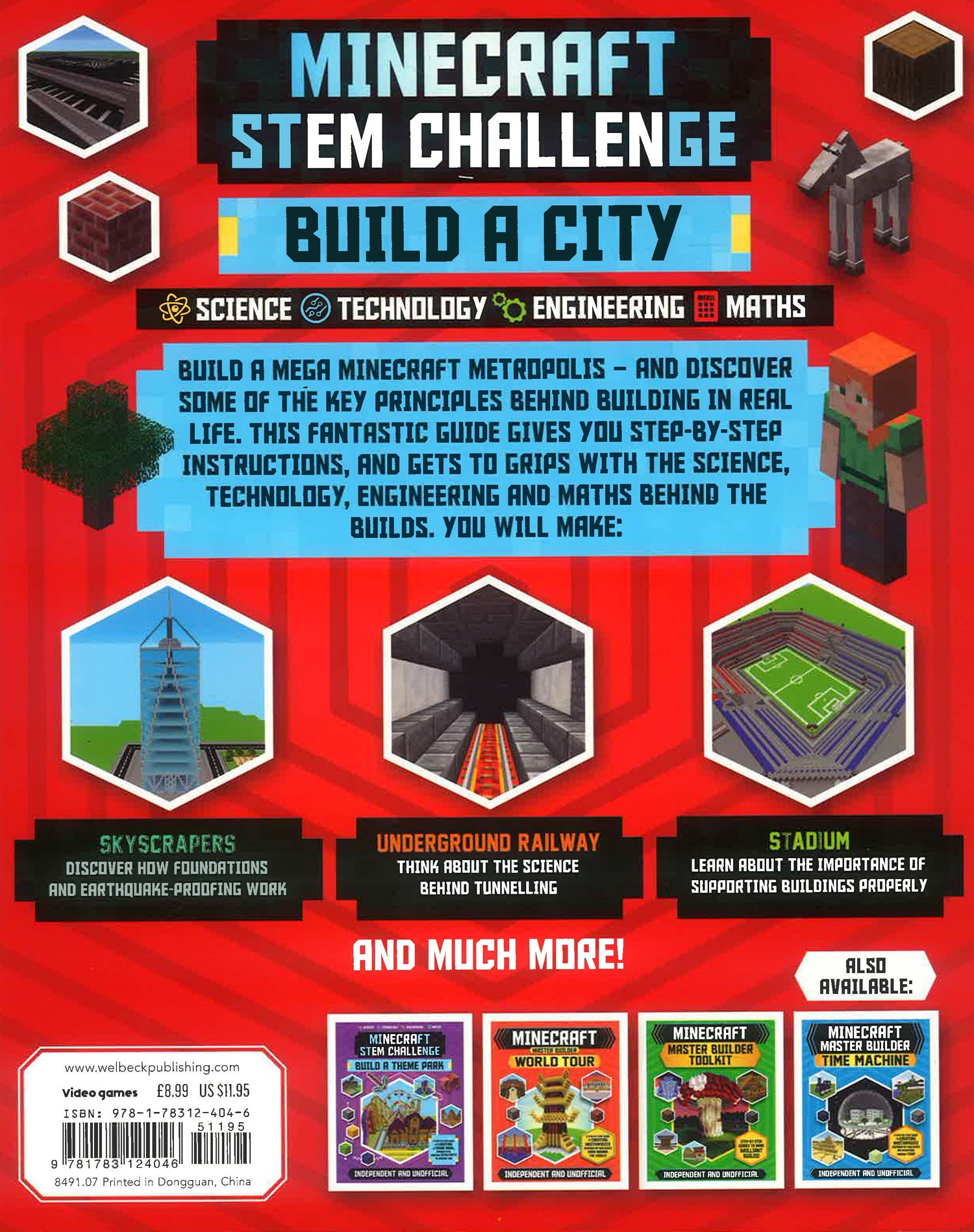Using core STEM principles, this book will take you step-by-step through the process of designing and constructing your own mega Minecraft city - from calculating area when building your foundations and understanding the different properties of the materials available to you, to learning about lighting and the use of symmetry in architecture. Read about science topics in the real world, then put your learning to use within the game, discovering the differences between real life and the Minecraft world. At the end of the book the reader will have created one amazing city, with skyscrapers, shops, a sports stadium, roads and houses.
