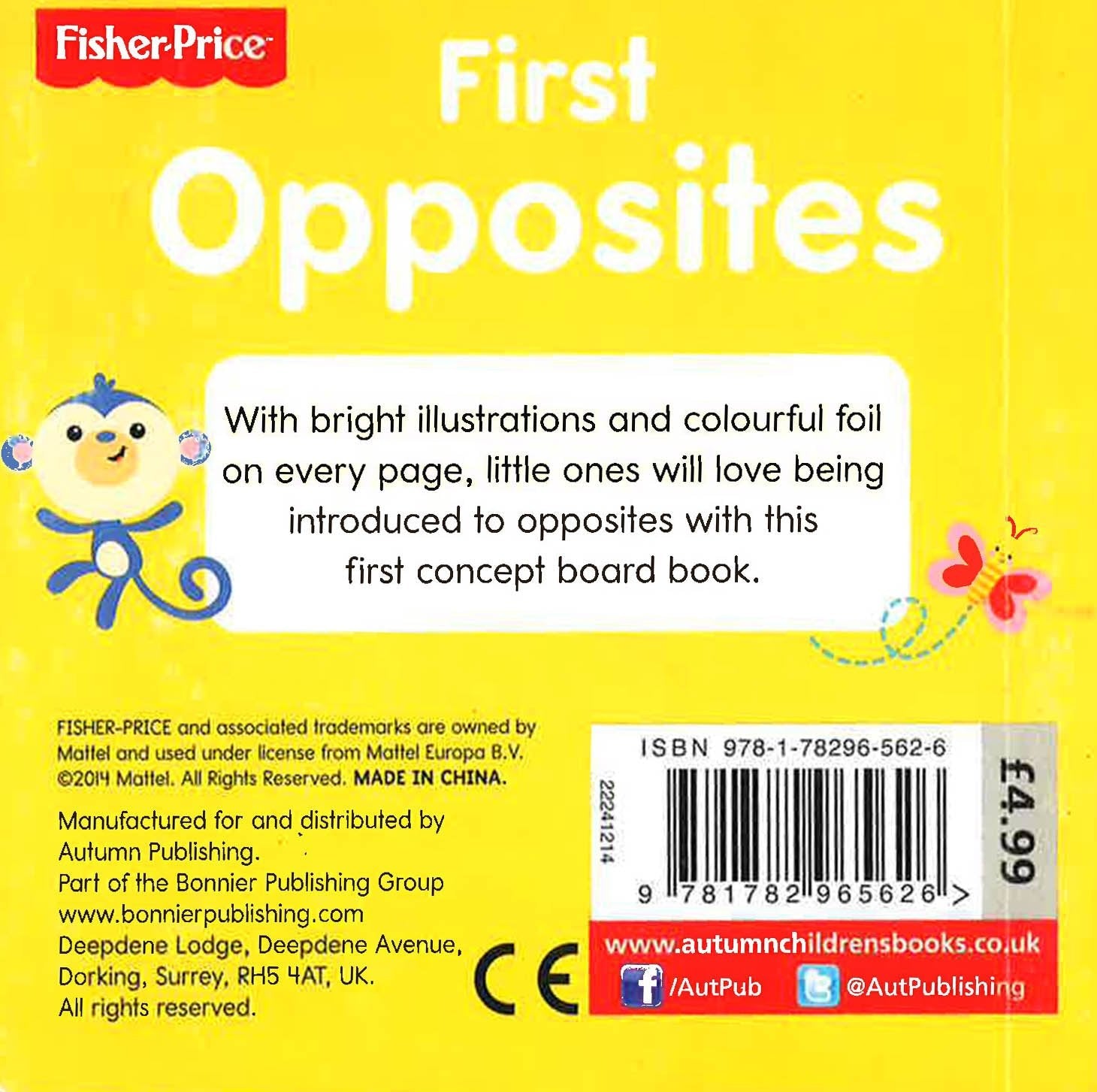 First concepts are introduced by Fisher-Price s Rainforest Friends in this sparkling foil board book. The book encourages object recognition and matching and its simple descriptive text helps expand vocabulary. With a different colour on each page foiled, little ones will love learning first opposites.