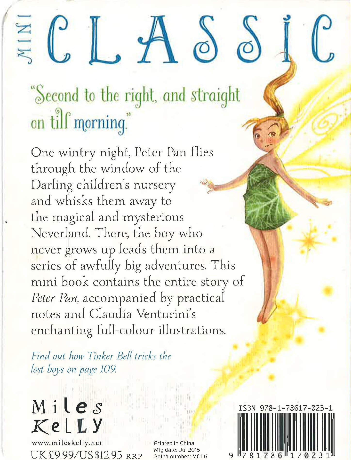 Enchantingly written, Mini Classic Peter Pan tells the story of the Darling children, who one night fly away to the Neverland with the mysterious and captivating Peter. There, they embark on adventures big and small, from battling pirates to playing make-believe with the lost boys, led by the one child who never grows up. Favourite characters and scenes have been reimagined in twenty beautiful full-colour plate illustrations by Claudia Venturini. Useful notes further enrich the reading experience.