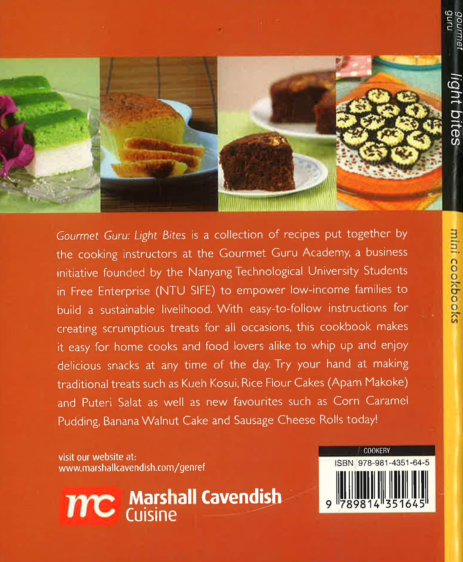 Gourmet Guru Light Bites is a collection of 35 recipes for tantalising sweet and savoury snacks. With easy-to-follow instructions for creating scrumptious treats for all occasions, this cookbook makes it easy for home cooks and food lovers alike to whip up and enjoy delicious snacks at any time of the day. These include traditional Malay cakes such as Kueh Kosui, Apam Makoke and Puteri Salat to contemporary offerings such as Corn Caramel Pudding, Bean Curd Pizza and Spinach, Sausage Cheese Rolls and Pan-fried Potatoes and Eggs.
