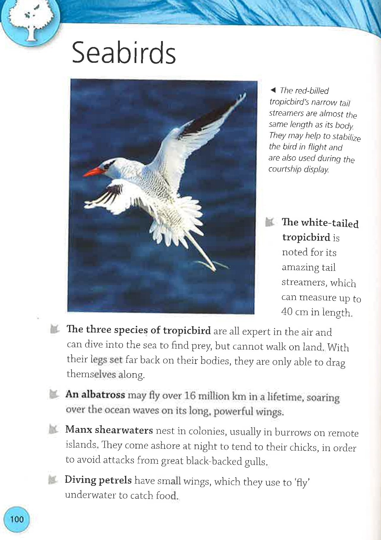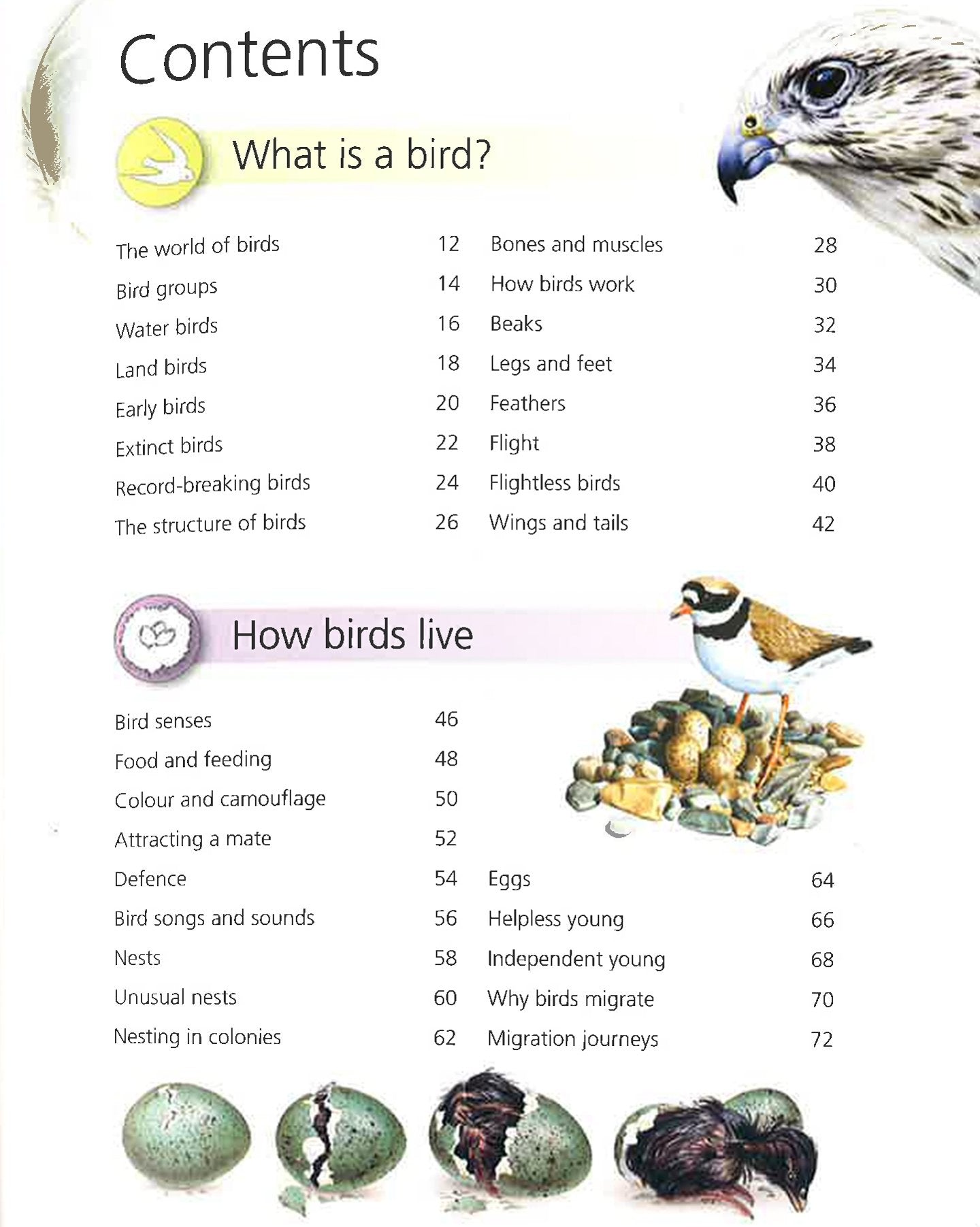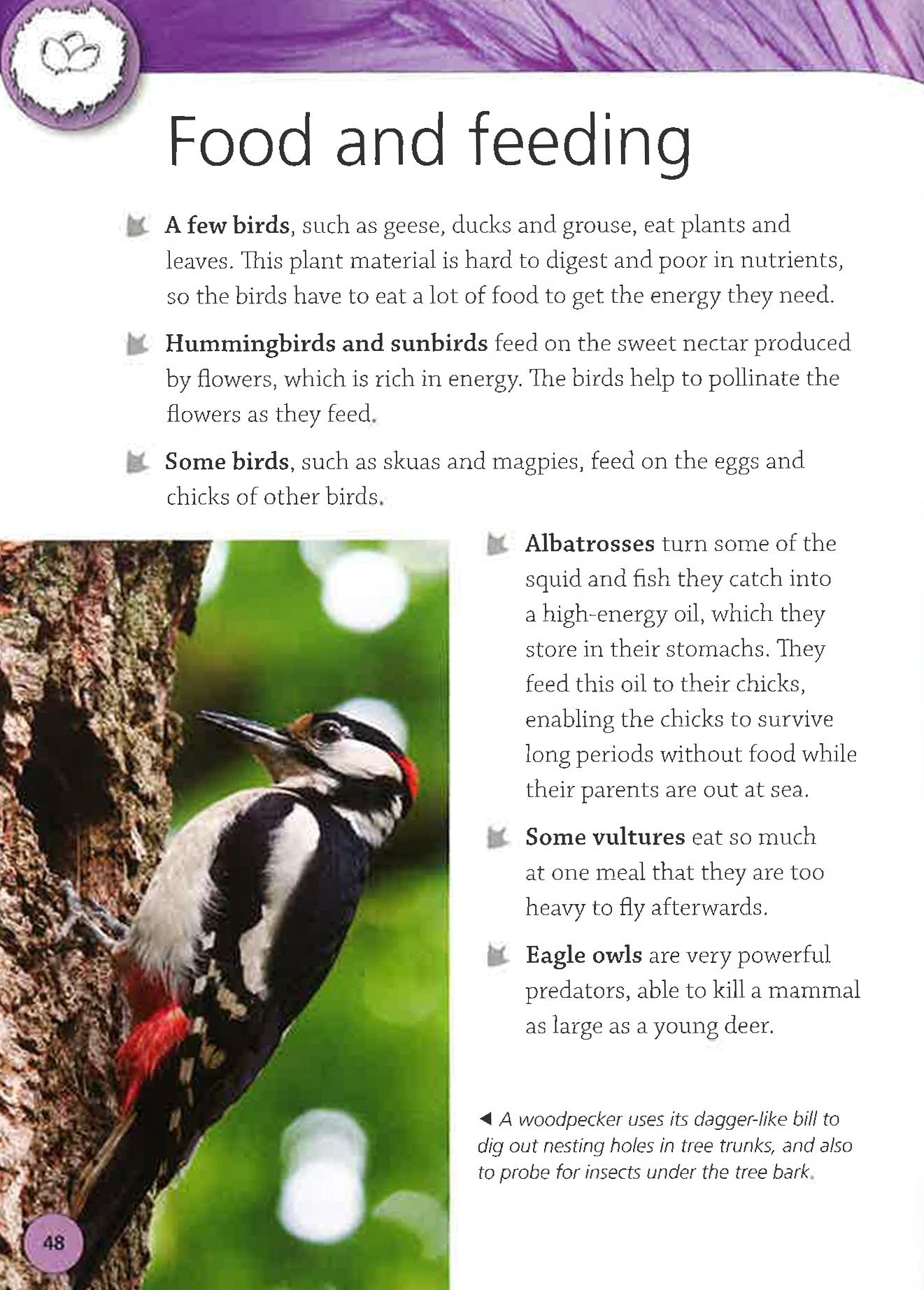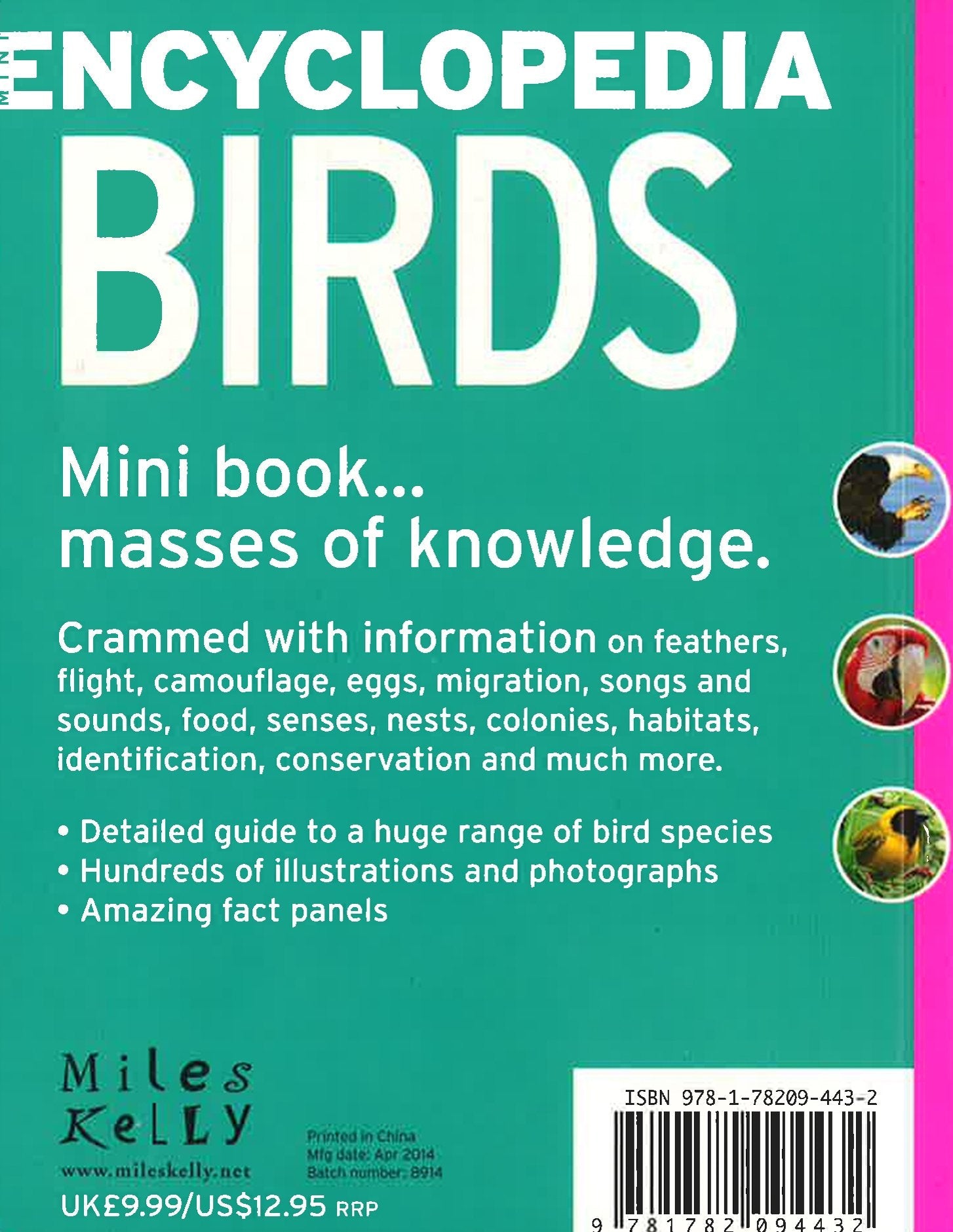 cCrammed full of information on feathers , flight , camouflage , eggs , migration , songs and sounds this book contains a detailed insight to a huge range of birds. Hundreds of illustrations and photoraphs and featuring amazing fact panals.