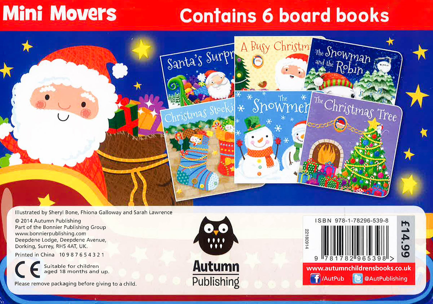 Mini Movers is a brand new format for Autumn Publishing, featuring 6 board books in a sturdy card slipcase. 'Christmas' features 6 festive-themed, rhyming stories, illustrated by Fhiona Galloway. AGES: 18months+ SELLING POINTS: * Collectible mini board books * Perfect for shared reading or readingalone * First concept themes promote early learning and encourages object recognition and identification * Key themes for each title helps build vocabulary * Colourful, fun illustrations * Sturdy, durable format * Simple rhyming text ***SLIP CASED set of 6 BOARD BOOKS***