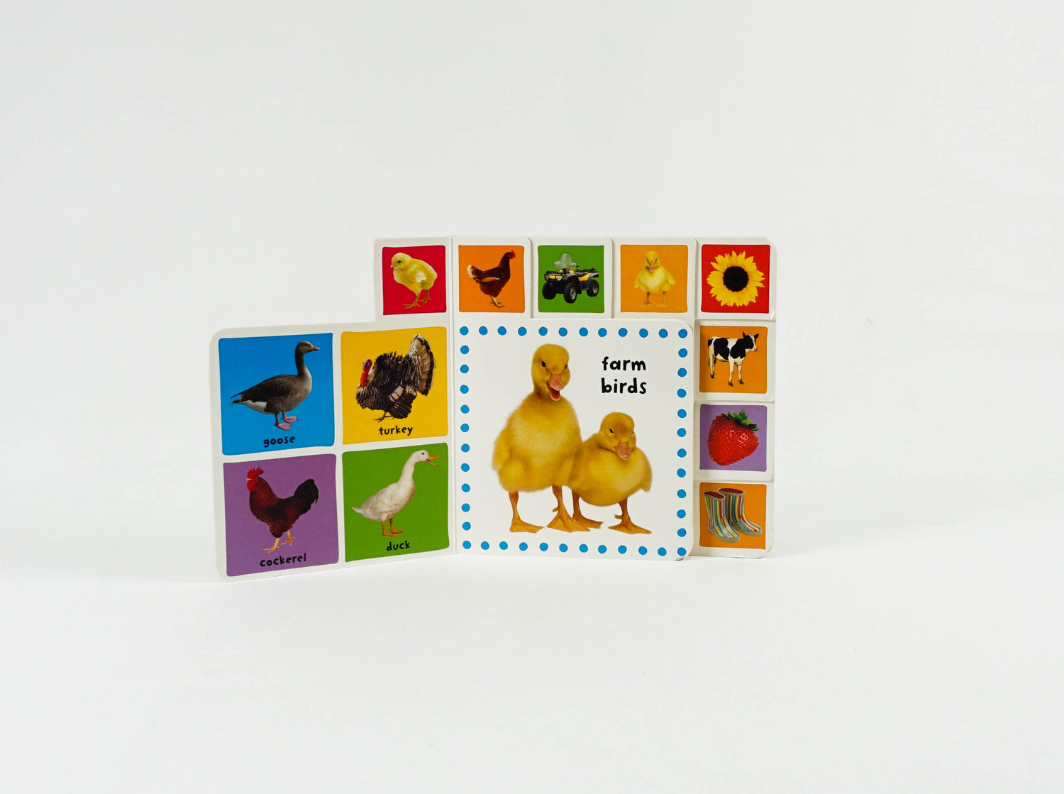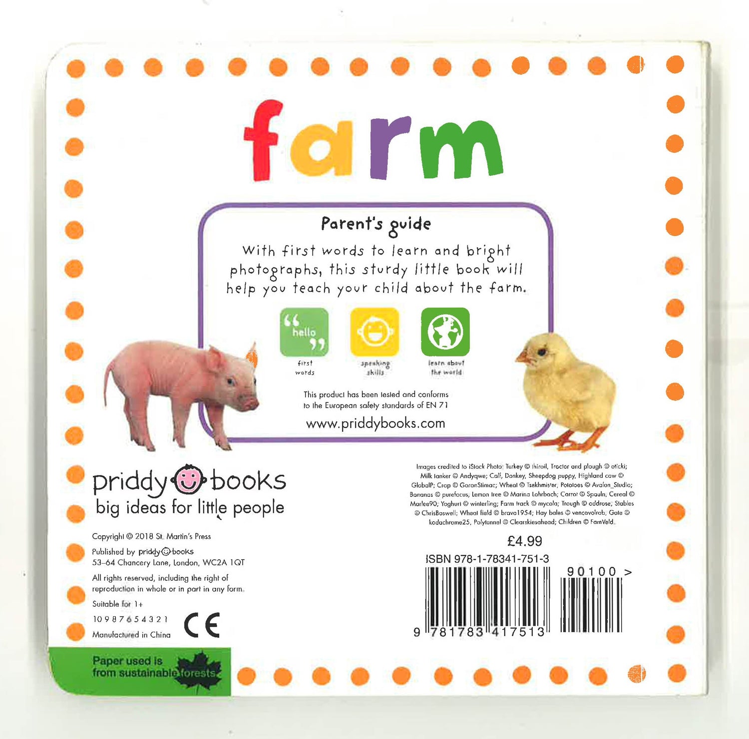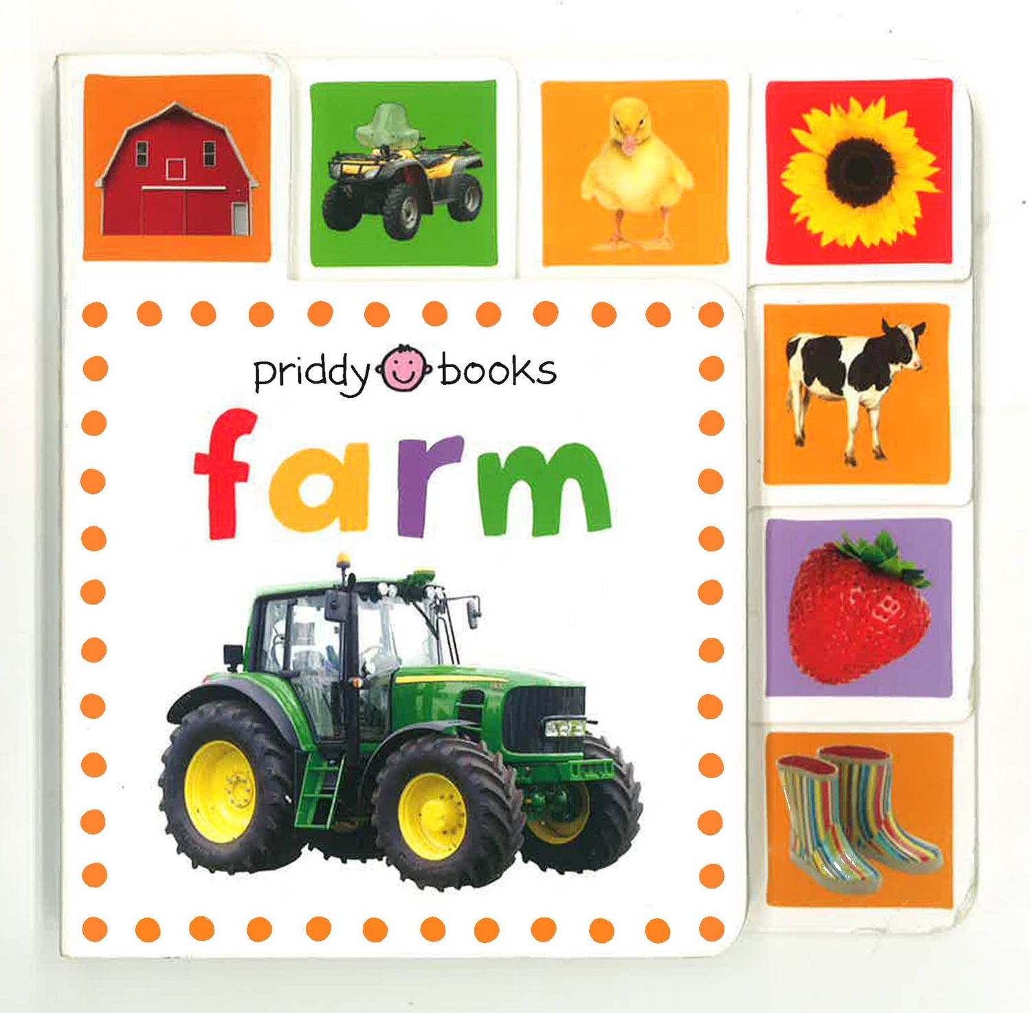 Roger Priddy's Mini tab books: Farm is a photographic board book designed to capture any baby's or toddler's attention. The colorful images of familiar objects, crops, animals, and farm vehicles will help young children learn all about the farm. The chunky format is also ideal for building dexterity and the tabs make turning the pages super easy!