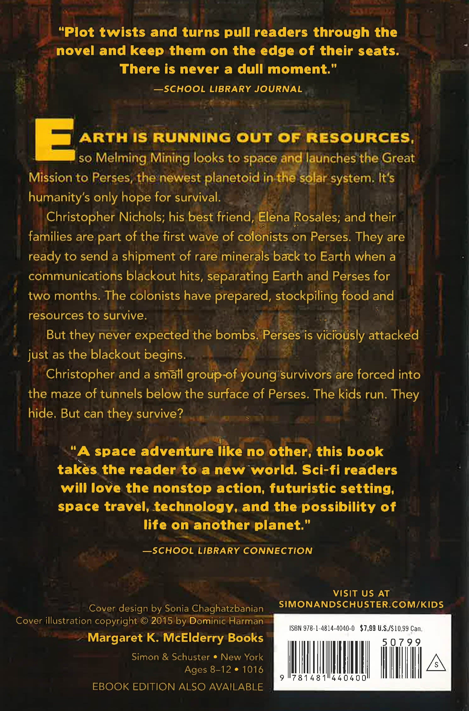 "Twelve-year-old Christopher Nichols and his family live on a new planet, Perses, as colonists of Melming Mining's Great Mission to save the earth. When Landers, as the attackers are called, obliterate the colony to steal the metal and raw ore, Christopher and a small group of survivors are forced into the maze of mining tunnels below the surface of Perses"-- A boy and his friends must find a way to survive in the mining tunnels after their new space colony is attacked in this gritty action-adventure novel, which School Library Journal called "a solid survival story." In space. Underground. And out of time. Christopher Nichols and his family live on a new planet, Perses, as colonists of Melming Mining's Great Mission to save the earth. Dozens of families like Christopher's have relocated, too, like his best friend Elena Rosales. A communications blackout with Earth hits, and all of Perses is on its own for three months. It's okay, though, because the colonists have prepared, stockpiling food and resources to survive. But they never prepared for an attack. Landers, as the attackers are called, obliterate the colony to steal the metal and raw ore. Now in a race against time, Christopher, along with a small group of survivors, are forced into the maze of mining tunnels. The kids run. They hide. But can they survive?