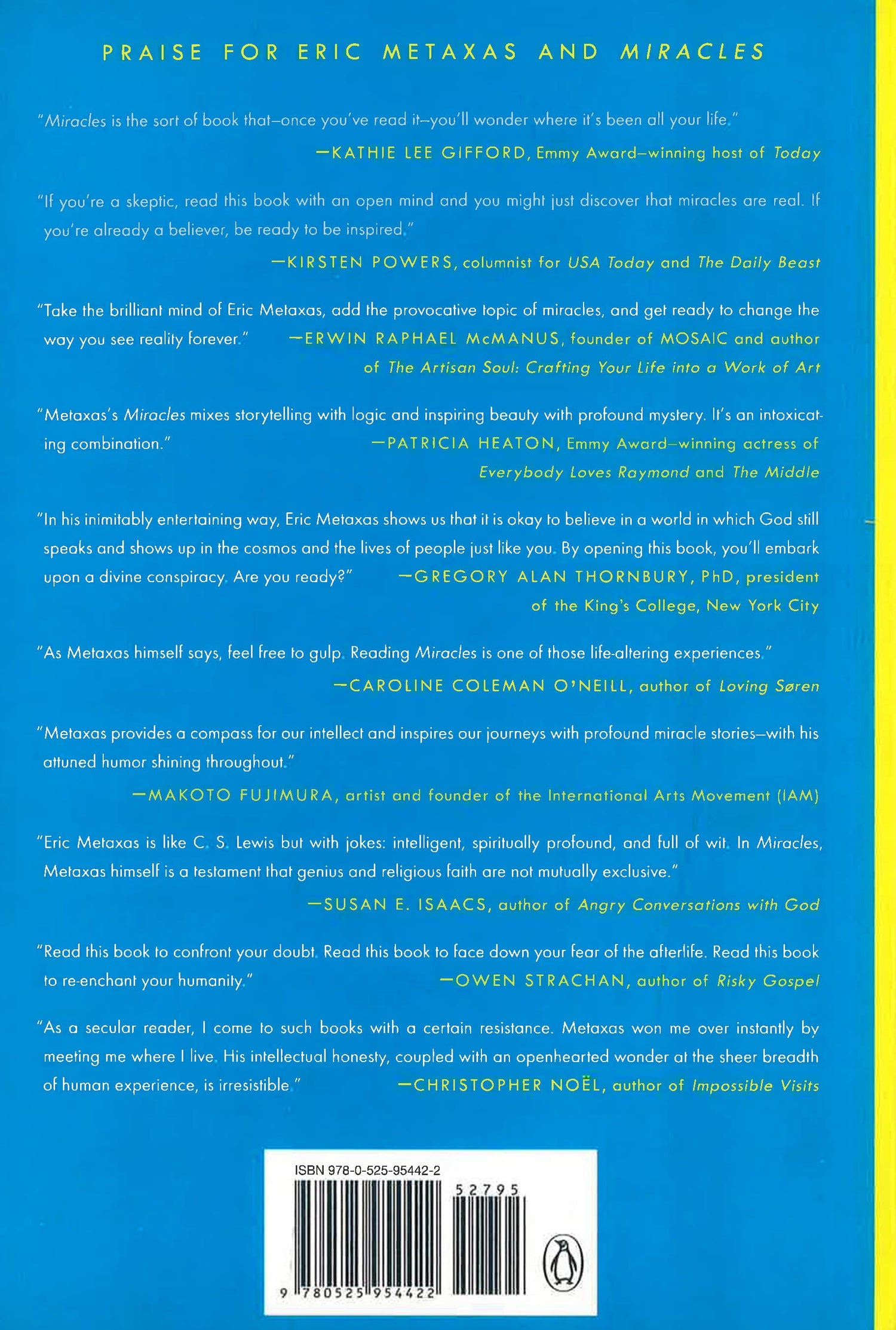 Not since C. S. Lewis in 1947 has an author of Eric Metaxas’s stature undertaken a major exploration of the phenomenon of miracles. In this groundbreaking work, Metaxas examines the compatibility between faith and science and provides well-documented anecdotal evidence of actual miracles. With compelling—sometimes electrifying—evidence that there is something real to be reckoned with, Metaxas offers a timely, civil, and thoughtful answer to recent books by Richard Dawkins, Christopher Hitchens, and Sam Harris. Already a New York Times bestseller, Miracles will be welcomed by both believers and skeptics—who will find their minds opening to the possibilities.