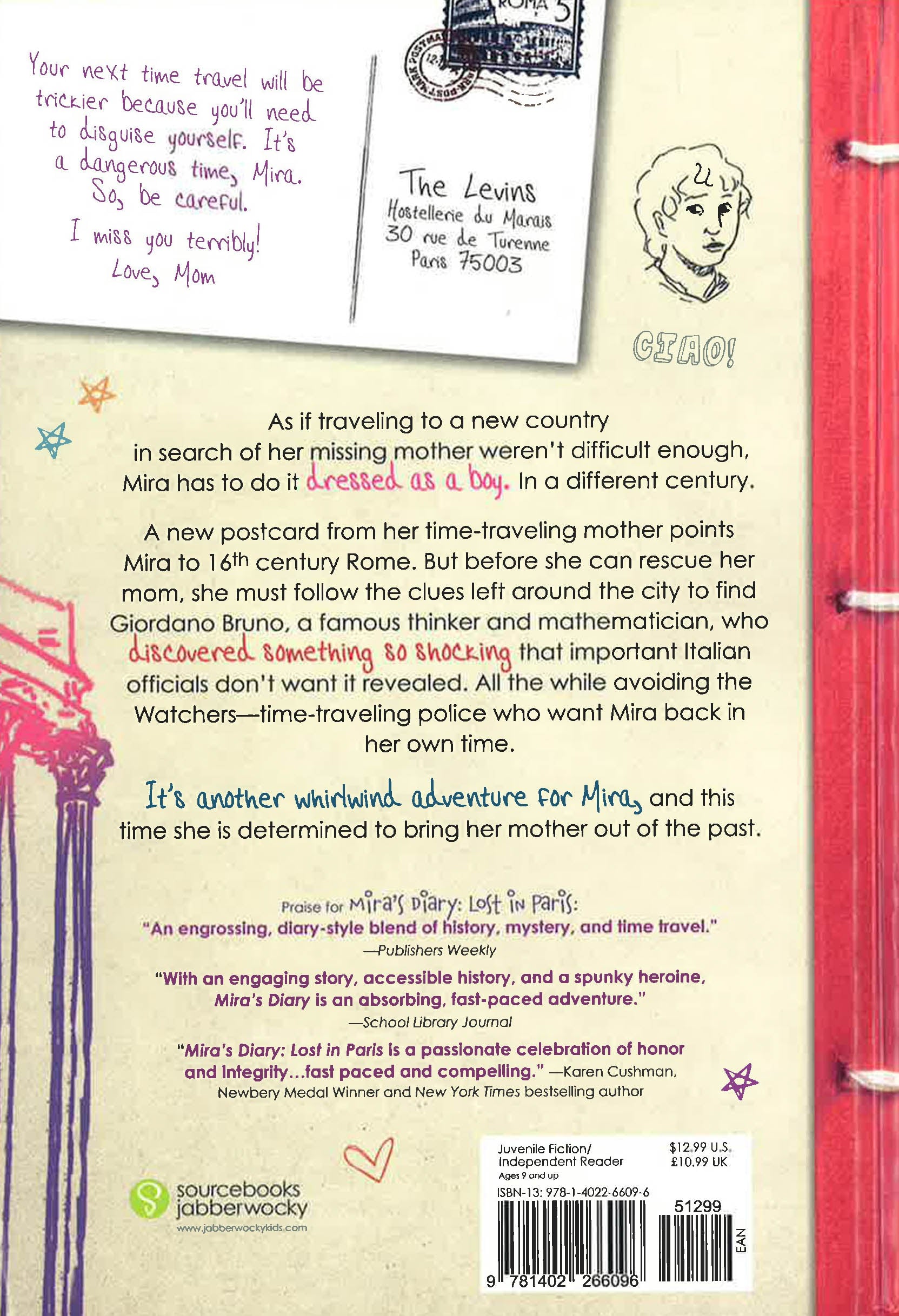 As if traveling to a new country in search of her missing mother weren't difficult enough, Mira has to do it dressed as a boy. In a different century. A new postcard from her time-traveling mother points Mira to the 16th century Rome. But before she can rescue her mom, she must follow the clues left around the city to find Giordano Bruno, a famous thinker and mathematician, who discovered something so shocking that important Italian officials don't want it revealed. All the while avoiding the Watchers--time-traveling police who want Mira back in her own time. It's another whirlwind adventure for Mira, and this time she is determined to bring her mother out of the past. Praise for Mira's Diary: Lost in Paris An engrossing, diary-style blend of history, mystery, and time travel."--Publishers Weekly With an engaging story, accessible history, and a spunky heroine, Mira's Diary is an absorbing, fast-pace adventure."--School Library Journal Mira's Diary: Lost in Paris is a passionate celebration of honor and integrity...fast paced and compelling."--Karen Cushman, Newberry Medal Winner and New York Times bestselling author