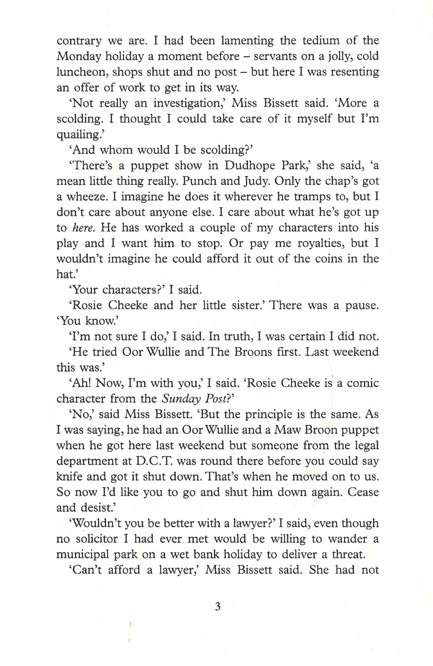 Something sinister is afoot in the streets of Dundee, when a puppeteer is found murdered behind his striped Punch and Judy stand, as children sit cross-legged drinking ginger beer. At once, Dandy Gilver's seemingly-innocuous investigation into plagiarism takes a darker turn. The gruesome death seems to be inextricably bound to the gloomy offices of Doig's Publishers, its secrets hidden in the real stories behind their girls' magazines The Rosie Cheek and The Freckle.