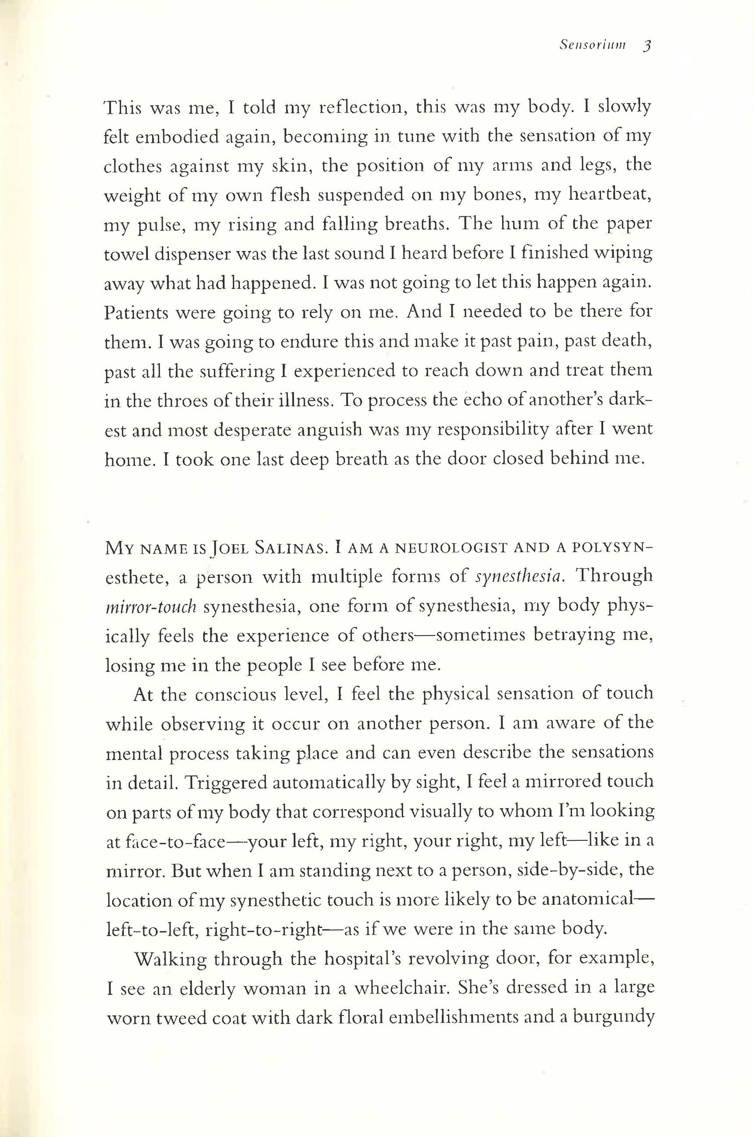 Challenging our understanding of what it means to be human, Joel Salinas, a Harvard-trained researcher and neurologist at Massachusetts General, shares his experiences with mirror-touch synesthesia, a rare and only recently identified neurological trait that causes him to feel the emotional and physical experiences of other people. Performing a spinal tap, he feels the needle slowly enter his lower back. If a disoriented patient flies into a confused rage, Salinas slips into a similarly agitated physical state, and when a patient dies, he experiences an involuntary ruin - his body starts to feel vacant and lifeless, like a limp balloon.Susceptible to the pain and discomfort of his patients, most of whom suffer from a host of disorders and extreme injuries, Salinas uses his trait to treat their symptoms, almost as if they were his own. At the same time, in his personal life, his mirror touch blurs the boundaries between himself and those close to him until he ends up inextricably entangled, no longer able to differentiate where he ends and someone else begins.Salinas refers to his condition as a kind of compulsory mindfulness, a heightened empathic ability that offers him invaluable clues about how to see and live the world through other people’s perspectives. This heightened sense of awareness is at the center of Mirror Touch. Through his experiences, both in his neurological practice and his personal life, Salinas offers readers insights about mirror-touch synesthesia and how the brain, in its endless wonder, can sometimes perform in a nearly superhuman, extrasensory way. In the process, Salinas reveals the full power and potential of his trait, as well as its thorny complications and often debilitating limitations.Beautifully written with intelligence and compassion and anchored by the latest developments in neurology, psychology and psychiatry, Mirror Touch is an enthralling and wholly original investigation into the unexplored corners of the brain, where the foundation of human experience and relationships take root - everything it means to think, to feel, and to be.