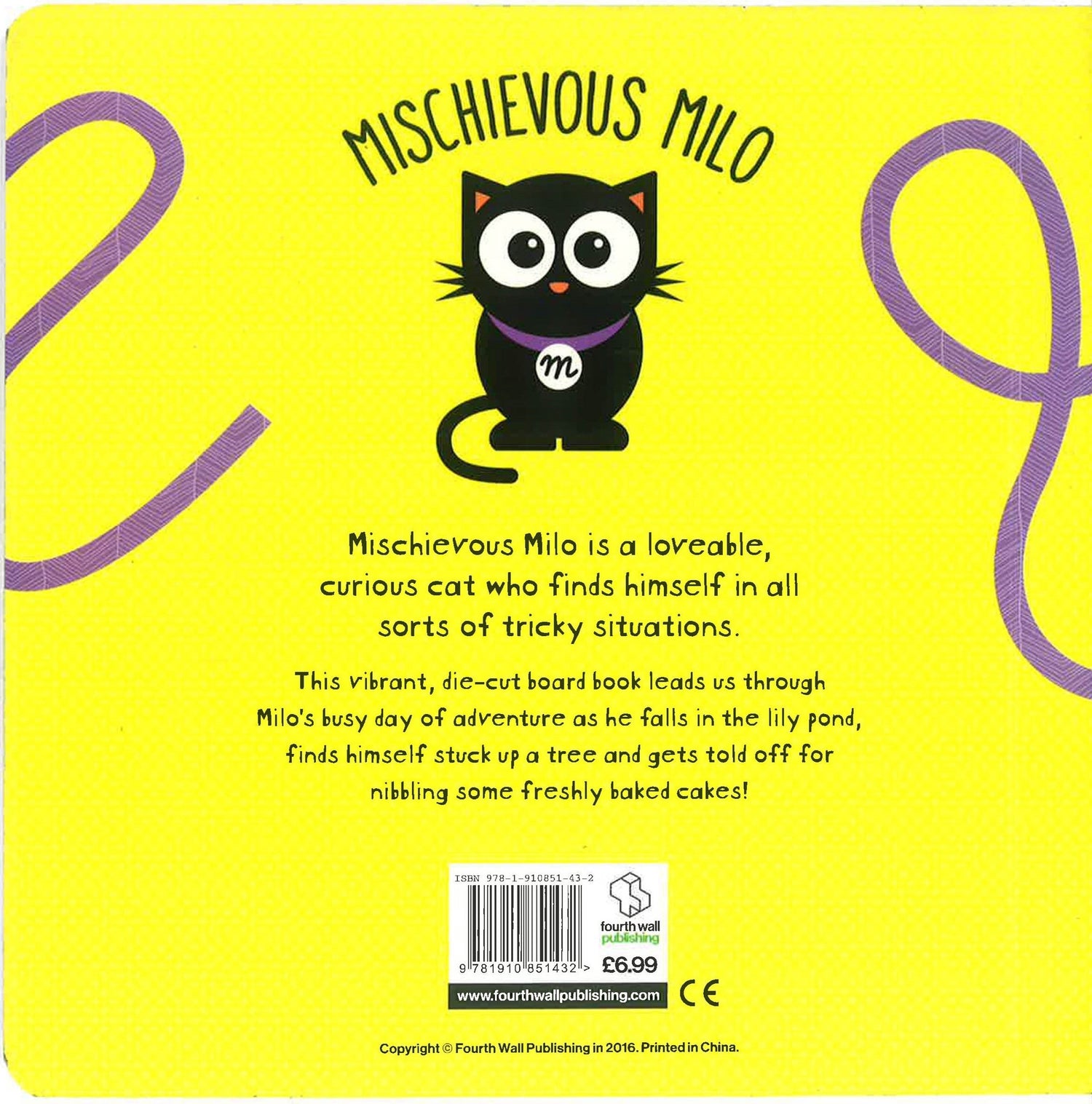 Mischievous Milo is a loveable, curious cat who finds himself in all sorts of tricky situations. This vibrant, die-cut board book leads us through Milo's busy day of adventure as he falls in the lily pond, finds himself stuck up a tree and gets told off for nibbling some freshly baked cakes!