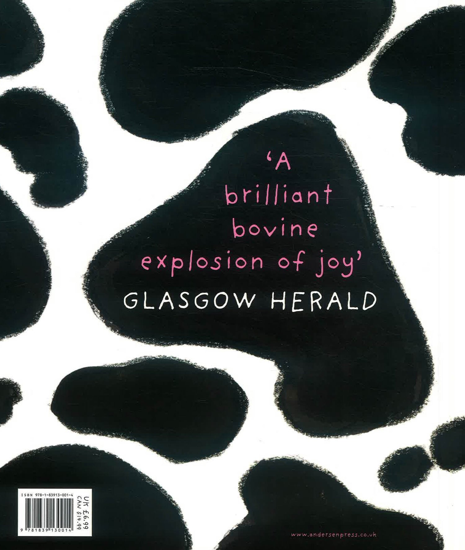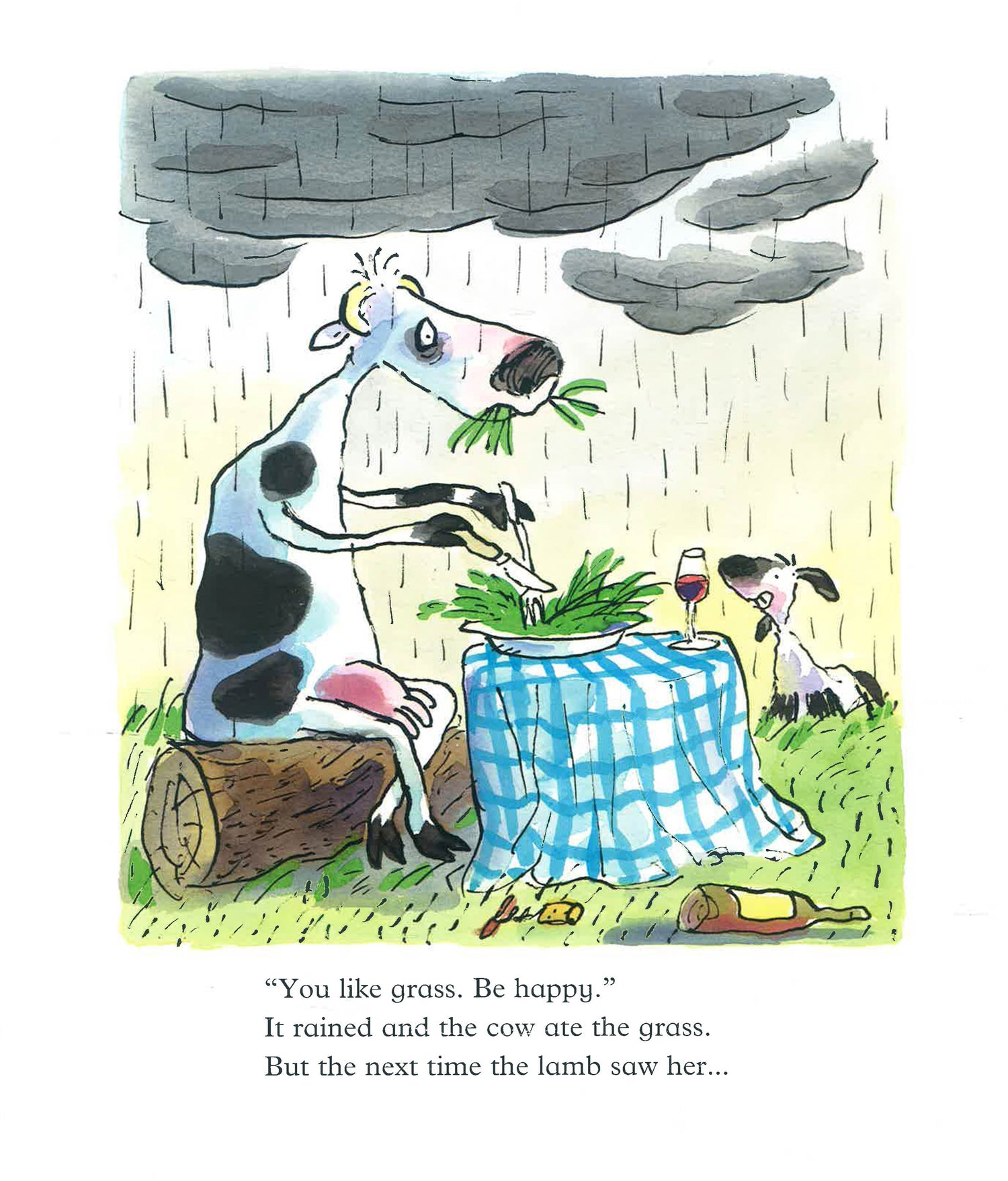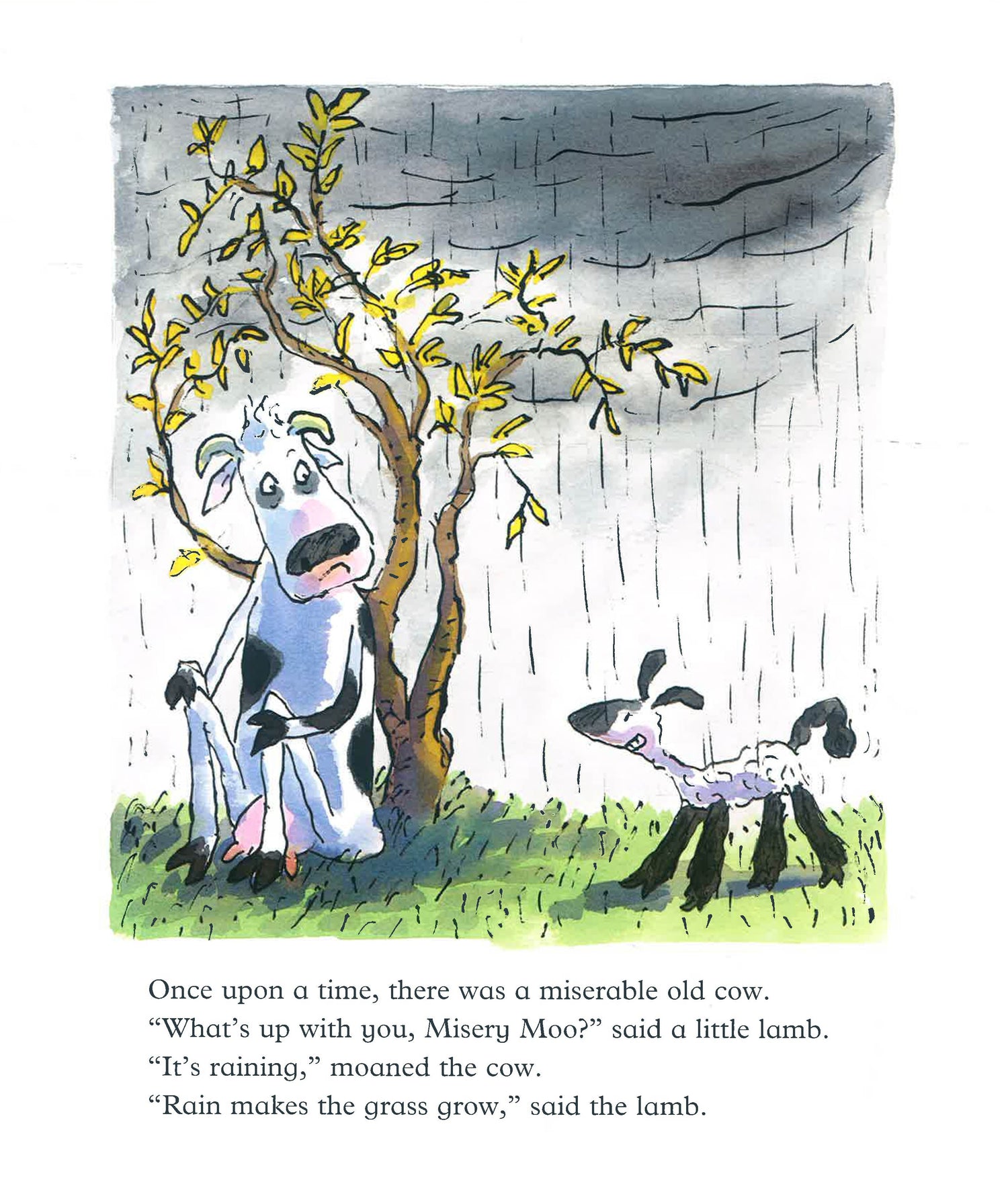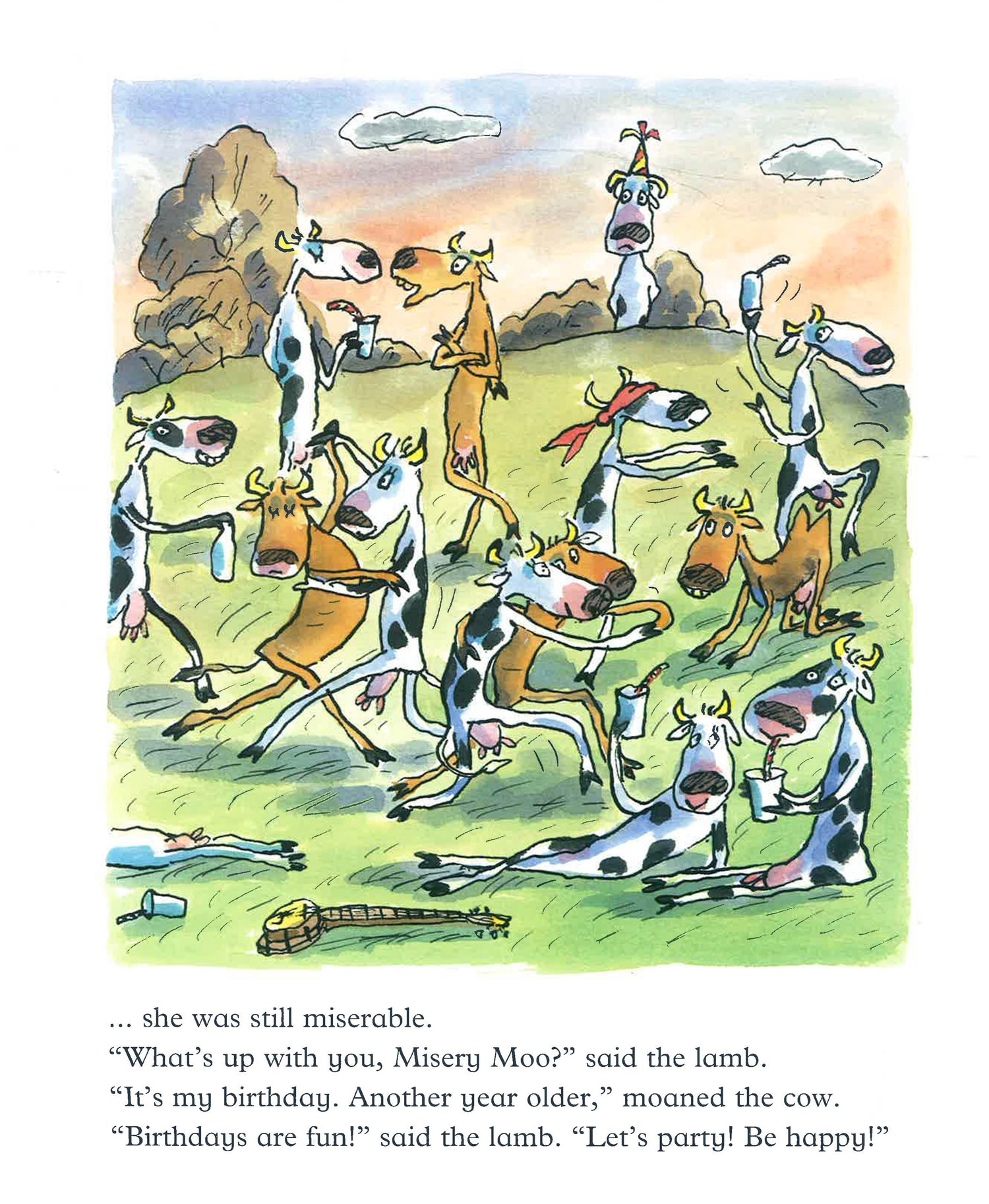 There was once a cow who was always miserable, and a lamb who tried to cheer her up. But the cow was impossible to cheer up! Even Father Christmas was too jolly for her. The poor lamb burst into tears himself, and wallowed in misery. Finally the cow started to miss him, and gave him the best birthday present ever - a great big grin!
