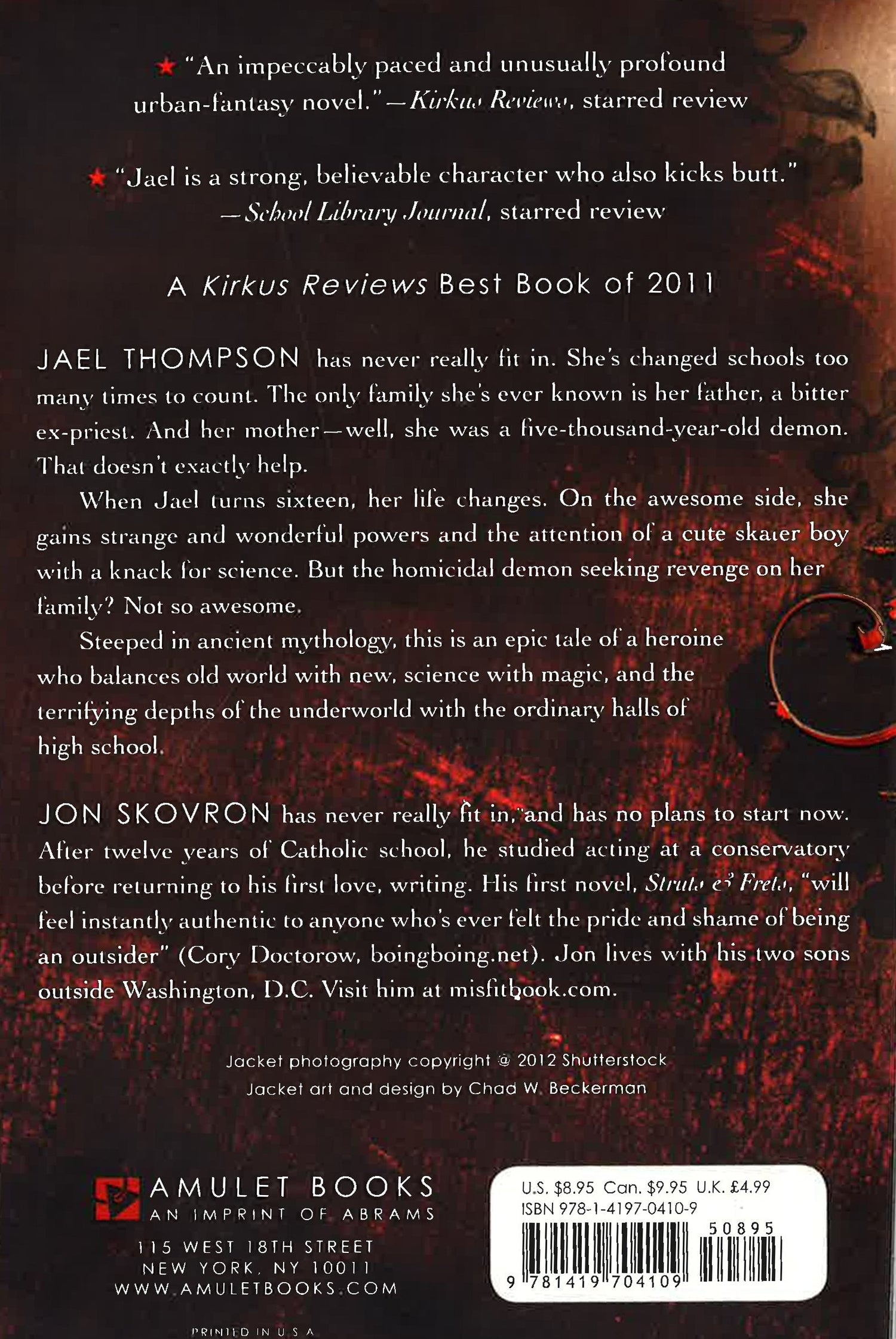 Jael has always felt like a freak. She has never kissed a boy, she never knew her mom, and her dad has always been superstrict but that s probably because her mom was a demon, which makes Jael half demon and most definitely not a normal sophomore girl. On her 16th birthday, a mysterious present unlocks her family s dangerous history and Jael s untapped potential. What was merely an embarrassing secret before becomes a terrifying reality. Jael must learn to master her demon side in order to take on a vindictive Duke of Hell, while also dealing with a twisted priest, best-friend drama, and a spacey blond skater boy who may have hidden depths. Author Jon Skovron takes on the dark side of human nature with his signature funny, heartfelt prose." *This book may have remainder mark*
