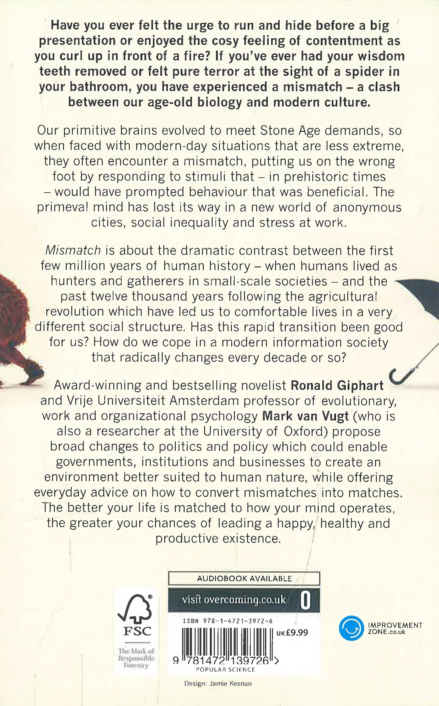 Our brains evolved to solve the survival problems of our Stone Age ancestors, so when faced with modern day situations that are less extreme, they often encounter a mismatch. Our primitive brains put us on the wrong foot by responding to stimuli that - in prehistoric times - would have prompted behaviour that was beneficial. If you've ever felt an anxious fight or flight response to a presenting at a board meeting, equivalent to facing imminent death by sabre-toothed tiger, then you have experienced a mismatch.Mismatch is about the clash between our biology and our culture. It is about the dramatic contrast between the first few million years of human history - when humans lived as hunters and gatherers in small-scale societies - and the past twelve thousand years following the agricultural revolution which have led us to comfortable lives in a very different social structure. Has this rapid transition been good for us? How do we, using our primitive minds, try to survive in a modern information society that radically changes every ten years or so?Ronald Giphart and Mark van Vugt show that humans have changed their environment so drastically that the chances for mismatch have significantly increased, and these conflicts can have profound consequences.Reviewed through mismatch glasses, social, societal, and technological trends can be better understood, ranging from the popularity of Facebook and internet porn, to the desire for cosmetic surgery, to our attitudes towards refugees.Mismatches can also affect our physical and psychological well-being, in terms of our attitudes to happiness, physical exercise, choosing good leaders, or finding ways to feel better at home or work.Finally, Mismatch gives us an insight into politics and policy which could enable governments, institutions and businesses to create an environment better suited to human nature, its potential and its constraints.This book is about converting mismatches into matches. The better your life is matched to how your mind operates, the greater your chances of leading a happy, healthy and productive life.