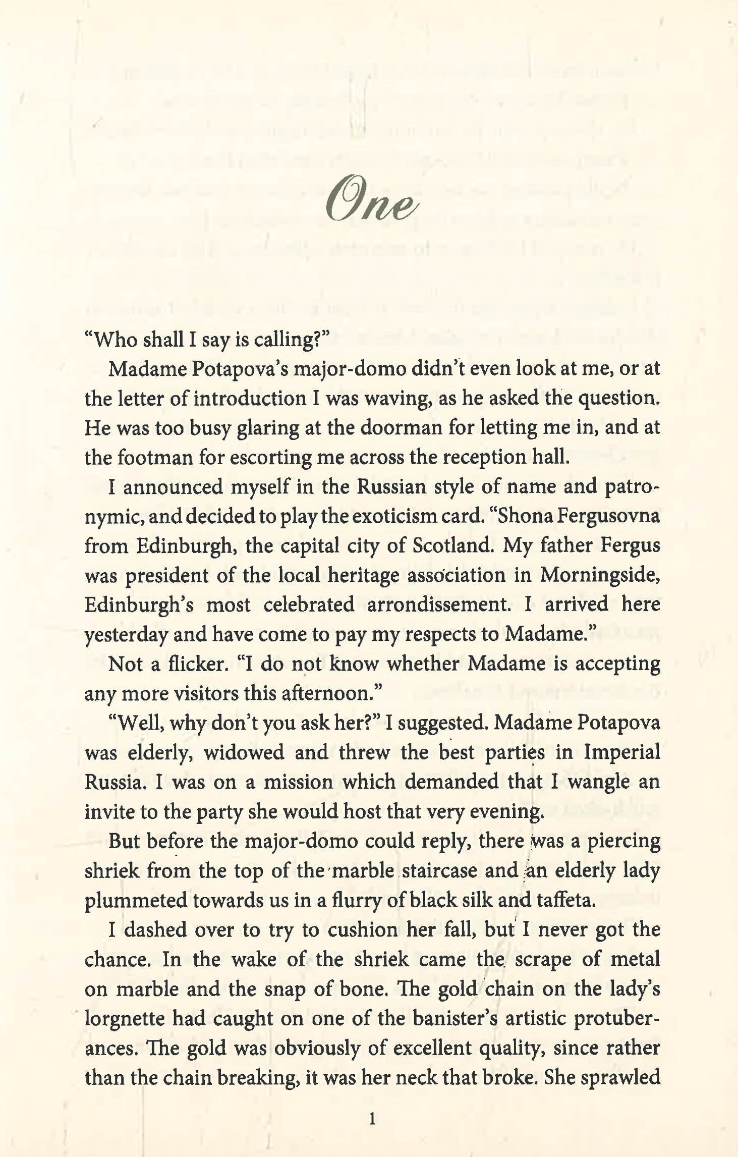 Shona is a proud former pupil of the Marcia Blaine School for Girls, but has a deep loathing for The Prime of Miss Jean Brodie, which she thinks gives her alma mater a bad name. An accomplished martial artist, linguist and musician, Shona is less successful when it comes to solving a murder mystery.