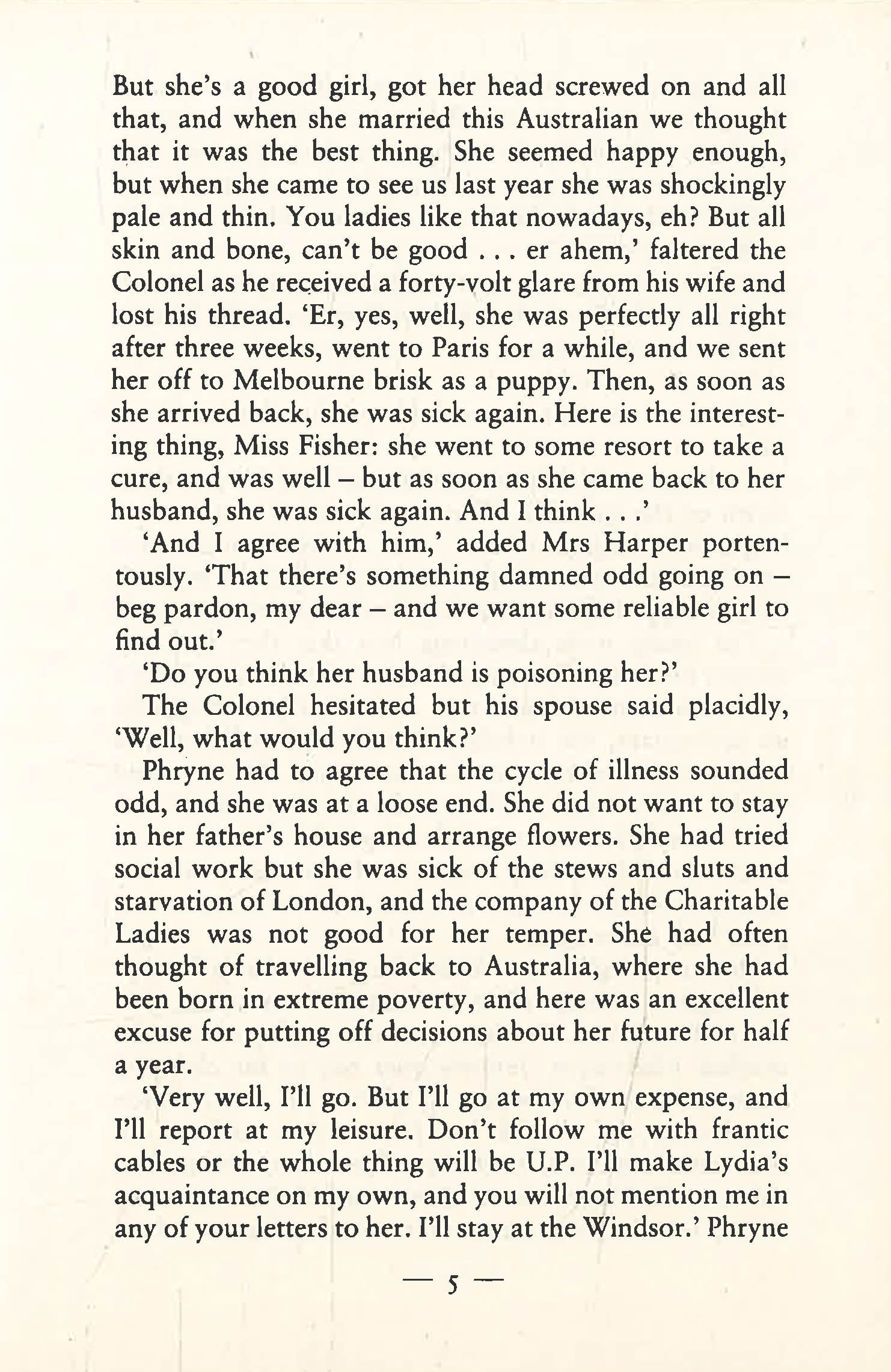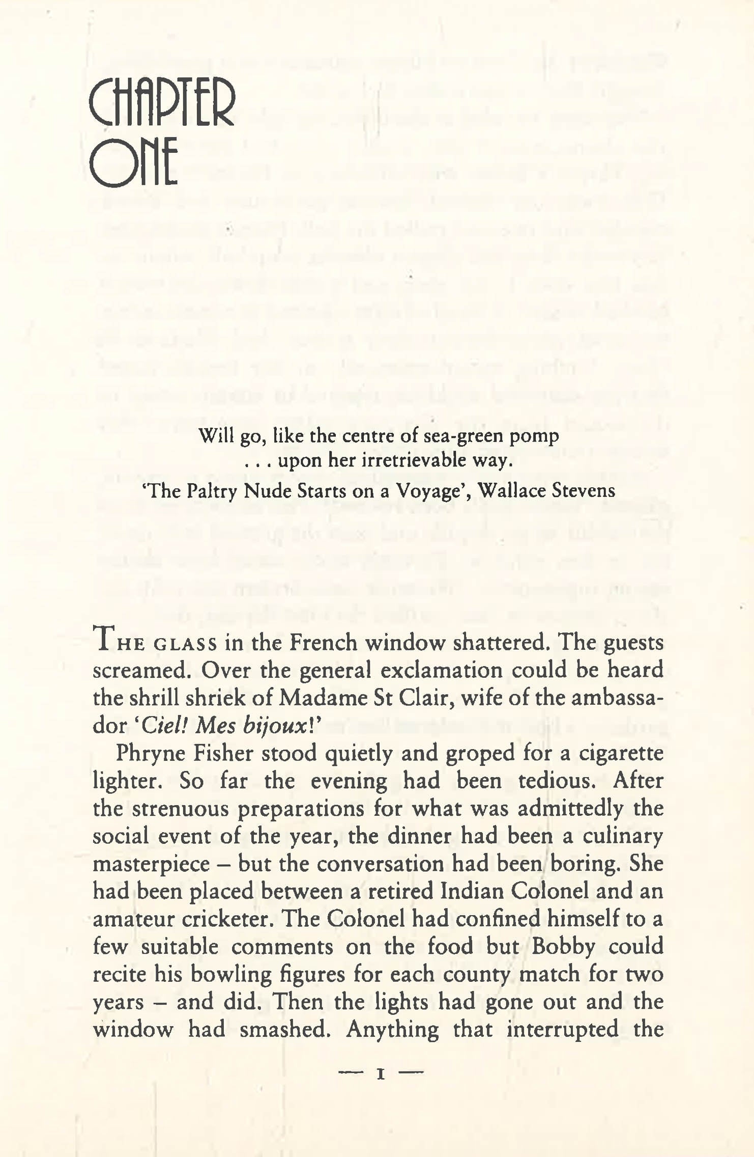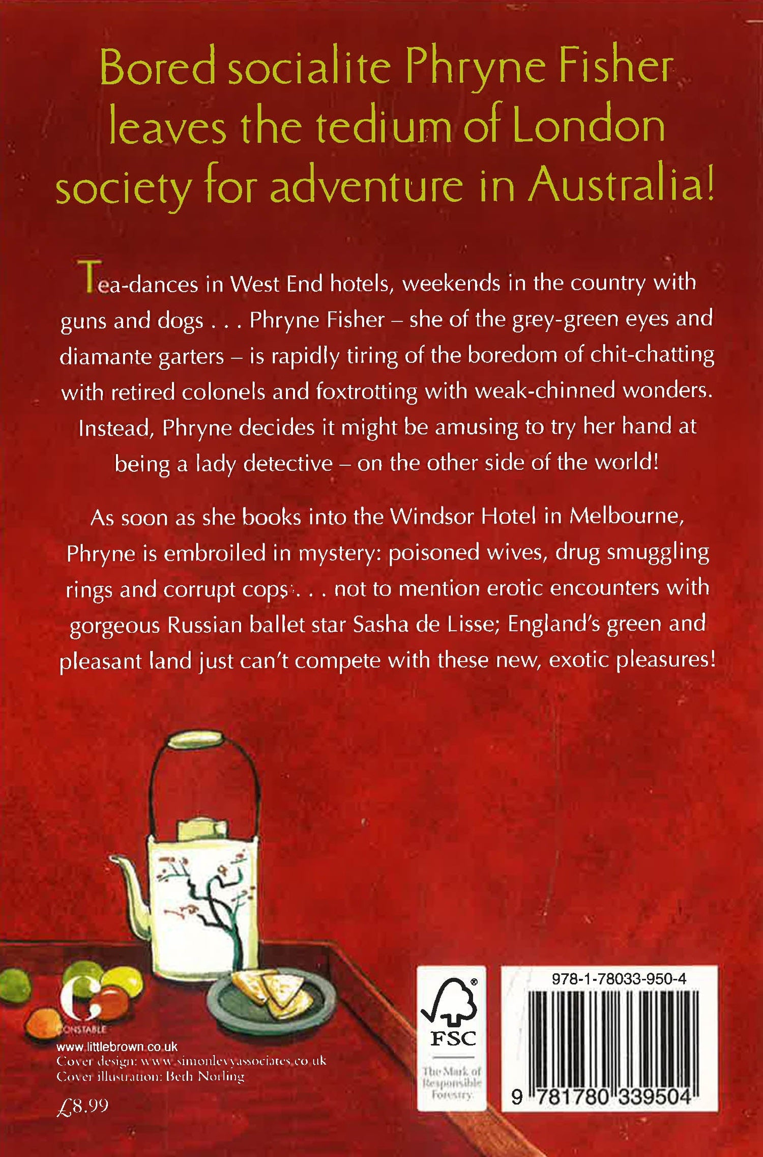 Tea-dances in West End hotels, weekends in the country with guns and dogs... Phryne Fisher - she of the grey-green eyes and diamante garters - is rapidly tiring of the boredom of chit-chatting with retired colonels and foxtrotting with weak-chinned wonders. Instead, Phryne decides it might be amusing to try her hand at being a lady detective - on the other side of the world!