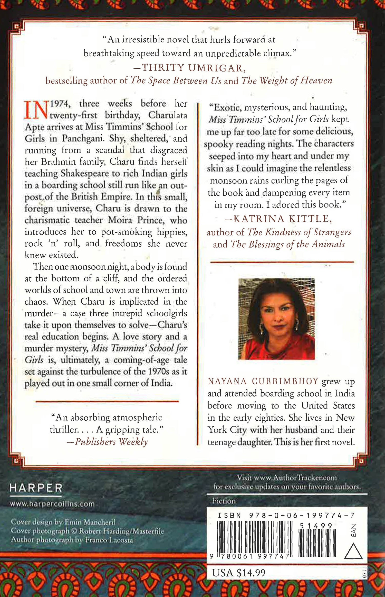 Miss Timmins' School for Girls is the truly dazzling debut of a major novelist, Nayana Currimbhoy. Set in India during the monsoon of 1974, it tells the story of a conventional young girl who leaves her cloistered small town home to teach at a remote boarding school run by British Missionaries. Part coming-of-age novel, part suspenseful murder mystery, Miss Timmins' School for Girls is a brilliant evocation of a colorful time and place--India during the love, drug, and rock 'n' roll era--complete with the sights, sounds, and music of the period seamlessly woven into the page-turning tale.