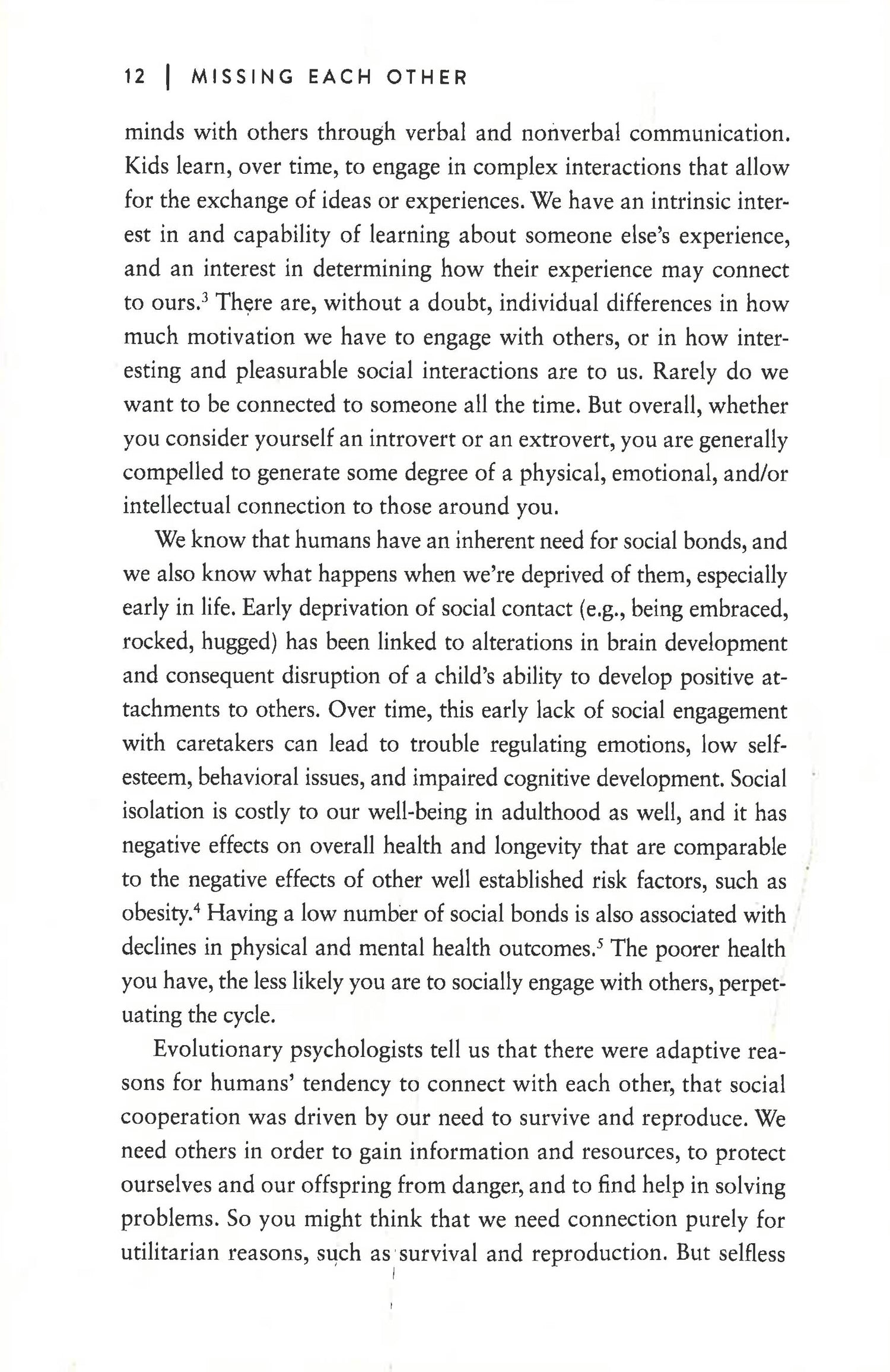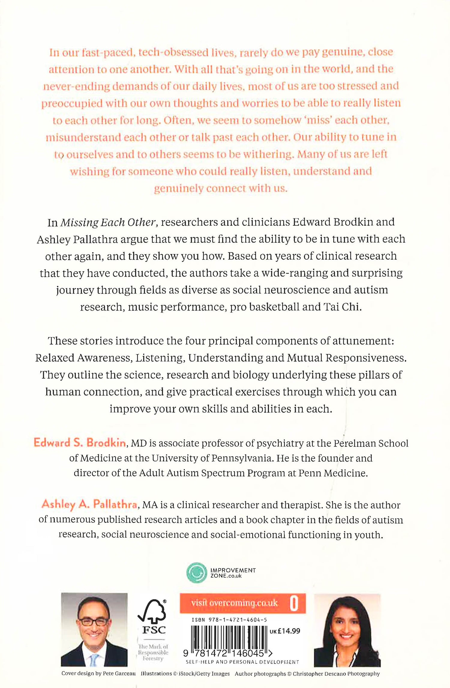 In our fast-paced, tech-obsessed lives, rarely do we pay genuine, close attention to one another. With all that's going on in the world, and the never-ending demands of our daily lives, most of us are too stressed and preoccupied with our own thoughts and worries to be able to really listen to each other for long. Often, we seem to somehow "miss" each other, misunderstand each other, or talk past each other. Our ability to tune in to ourselves and to others seems to be withering. Many of us are left wishing for someone who could really listen, understand, and genuinely connect with us.In Missing Each Other, researchers and clinicians Edward Brodkin and Ashley Pallathra argue that we must find the ability to be in tune with each other again, and they show us how. Based on years of research that they conducted together in a National Institutes of Mental Health-funded clinical study, the authors take a wide-ranging and surprising journey through fields as diverse as social neuroscience and autism research, music performance, pro basketball, and tai chi. They use these stories to introduce the four principal components of attunement: Relaxed Awareness, Listening, Understanding, and Mutual Responsiveness. They outline the science, research, and biology underlying these pillars of human connection, but also providing readers with exercises through which they can improve their own skills and abilities in each.
