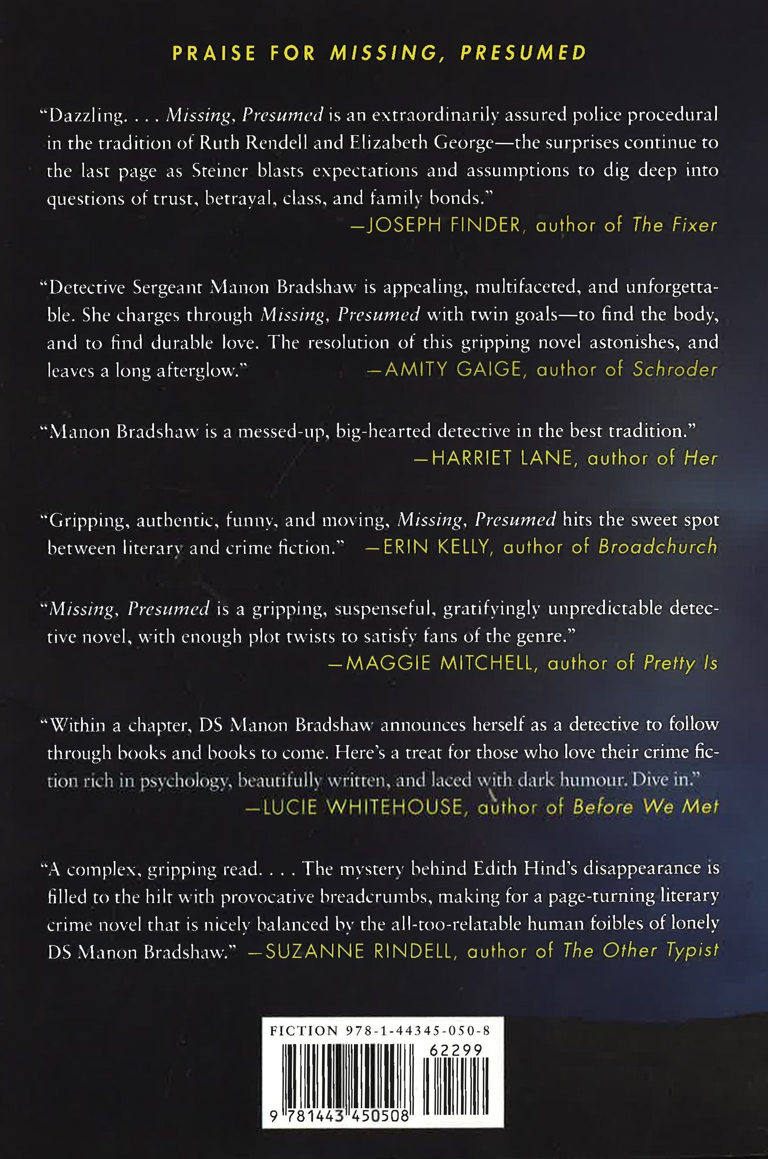 At thirty-nine, Manon Bradshaw is a devoted and respected member of the Cambridgeshire police force, and though she loves her job, what she longs for is a personal life. Single and distant from her family, she wants a husband and children of her own. One night, after yet another disastrous internet date, she turns on her police radio to help herself fall asleep?and receives an alert that sends her to a puzzling crime scene. Edith Hind?a beautiful graduate student at Cambridge University and daughter of the surgeon to the Royal Family?has been missing for nearly twenty-four hours. Her home offers few clues: a smattering of blood in the kitchen, her keys and phone left behind, the front door ajar but showing no signs of forced entry. Manon instantly knows that this case will be big?and that every second is crucial to finding Edith alive. The investigation starts with Edith?s loved ones: her attentive boyfriend, her reserved best friend, her patrician parents. As the search widens and press coverage reaches a frenzied pitch, secrets begin to emerge about Edith?s tangled love life and her erratic behavior leading up to her disappearance. With no clear leads, Manon summons every last bit of her skill and intuition to close the case, and what she discovers will have shocking consequences not just for Edith?s family but for Manon herself. Suspenseful and keenly observed, Missing, Presumed is a brilliantly twisting novel of how we seek connection, grant forgiveness, reveal the truth about who we are.