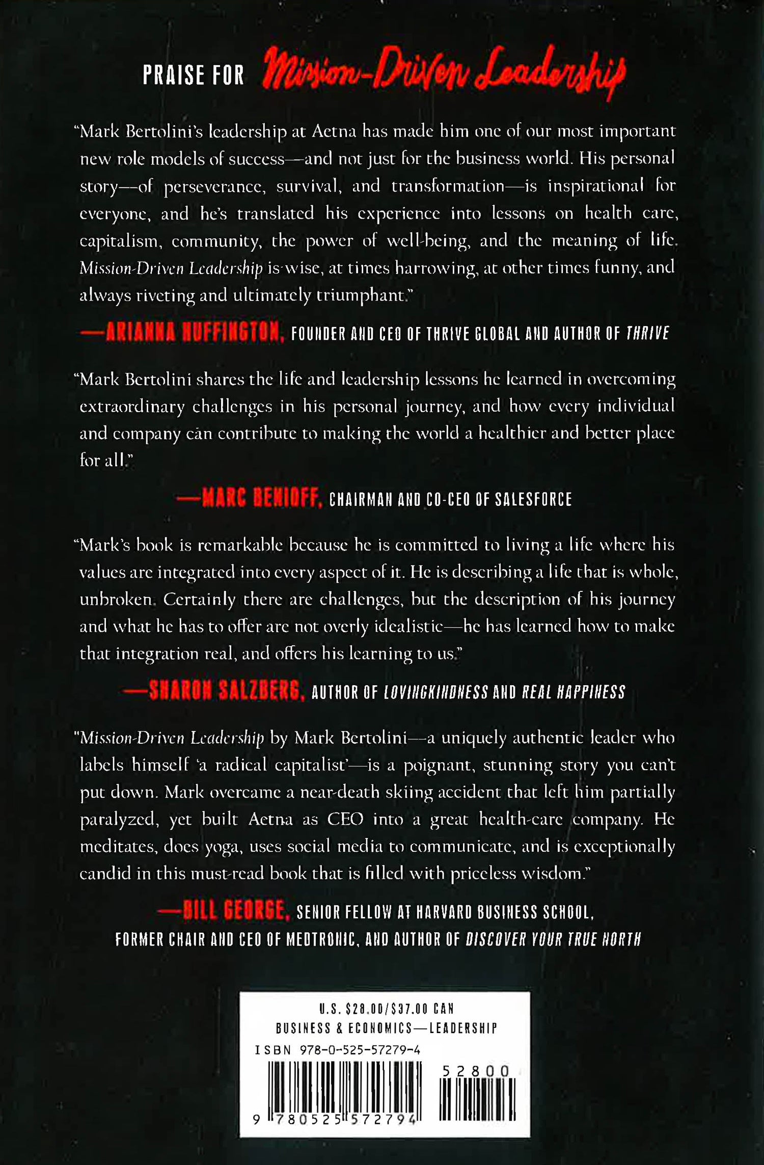 In Mission-Driven Leadership, Mark Bertolini, the long-time chairman and CEO of Aetna, the Fortune 500 health insurance company, reveals that genuine leadership is not about dollars and market share but about improving lives and communities. Mark Bertolini didn't get to the corner office through traditional means. He grew up in a blue-collar neighborhood in Detroit. Early in his career, he was known for his bare-knuckled leadership and hard driving competitiveness that helped him to turnaround several companies. But his ambition came at a cost as he ran roughshod over his colleagues and employees, and spent time away from his family. Two events served as wakeup calls for the hard-charging Bertolini. First his son Eric was diagnosed with incurable cancer, and Bertolini found himself confronting the healthcare industry firsthand, not as an executive, but as the parent of a deathly ill child, determined to save his son's life. And miraculously, after a year in the hospital, often at death's door--Eric was twice given last rites--his son recovered. The second wakeup call was a skiing accident several years later in which Bertolini broke his neck. As his life unraveled in the face of years of chronic pain, therapy, and medication, he realized he had to reinvent himself, emotionally, spiritually, and as a leader--or go under. Mission-Driven Leadership speaks to the lessons Bertolini learned about empathy, about helping employees and Aetna's customers take better care of themselves and each other, about the need to find the divine in me, and the importance of getting out to meet with employees and customers face-to-face in town halls to truly discover their needs and better serve them.