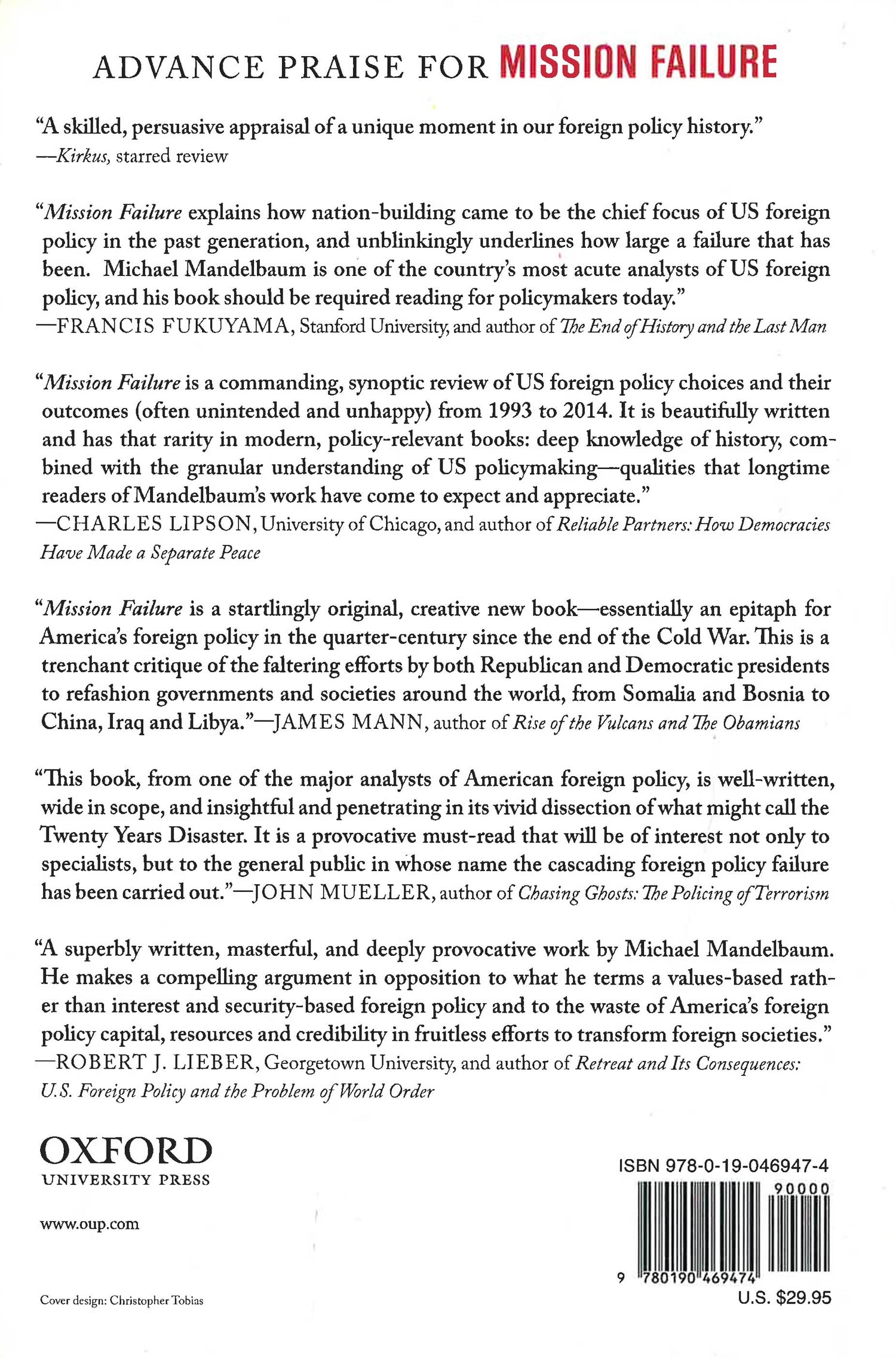 Unbeknownst to just about all observers of international affairs, America's decision in 1991 to provide air defense to oppressed Kurds in Iraq after the Gulf War had ended ushered in an entirely new era in American foreign policy. Until that moment, the United States used military power to defend against threats (real and perceived) that its leaders thought would either weaken America's position in the world order or-in the worst case-threaten the homeland. For the first time ever, the United States militarily was now actively involved in states that represented no threat, and with missions that were largely humanitarian and socio-political. After establishing the Kurdish no-fly zone, the US in quick succession intervened in Somalia, Haiti, and Kosovo. Even after 9/11, it decided that it had a duty to not just invade Iraq, but reconstruct Iraqi society along Western lines. In Mission Failure, the eminent international relations scholar Michael Mandelbaum provides a sweeping interpretive history of American foreign policy in the post-Cold War era to show why this new approach was doomed to failure. America had always adhered to a mission-based foreign policy, but in the post-Cold War era it swung away from security concerns to a near-exclusive emphasis on implanting Western institutions wherever it could. Many good things happened in this era, including a broad expansion of democracy and strong growth in the global economy. But the U.S. never had either the capacity or the will to change societies that were dramatically different from our own. Over two decades later, we can see the wreckage: a broken Iraq a teetering Afghanistan, a China that laughs at our demands that they adopt a human rights regime, and a still-impoverished Haiti. Mandelbaum does not deny that American foreign policy has always had a strong ideological component. Instead, he argues that emphasizing that particular feature generally leads to mission failure. We are able to defend ourselves well and effectively project power, but we have very little capacity to change other societies. If nothing else, that is what the last quarter century has taught us.