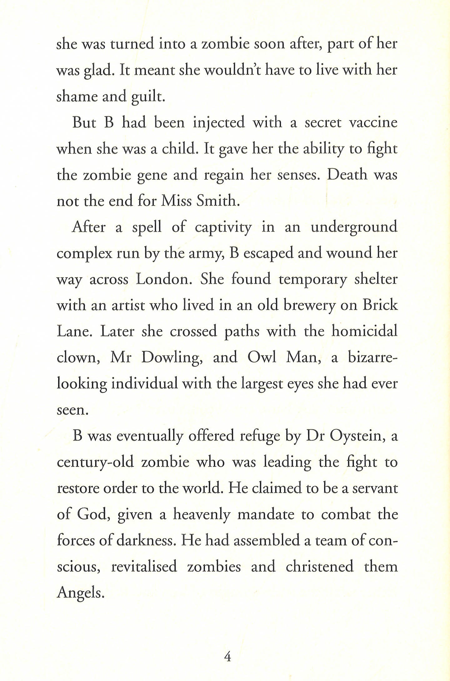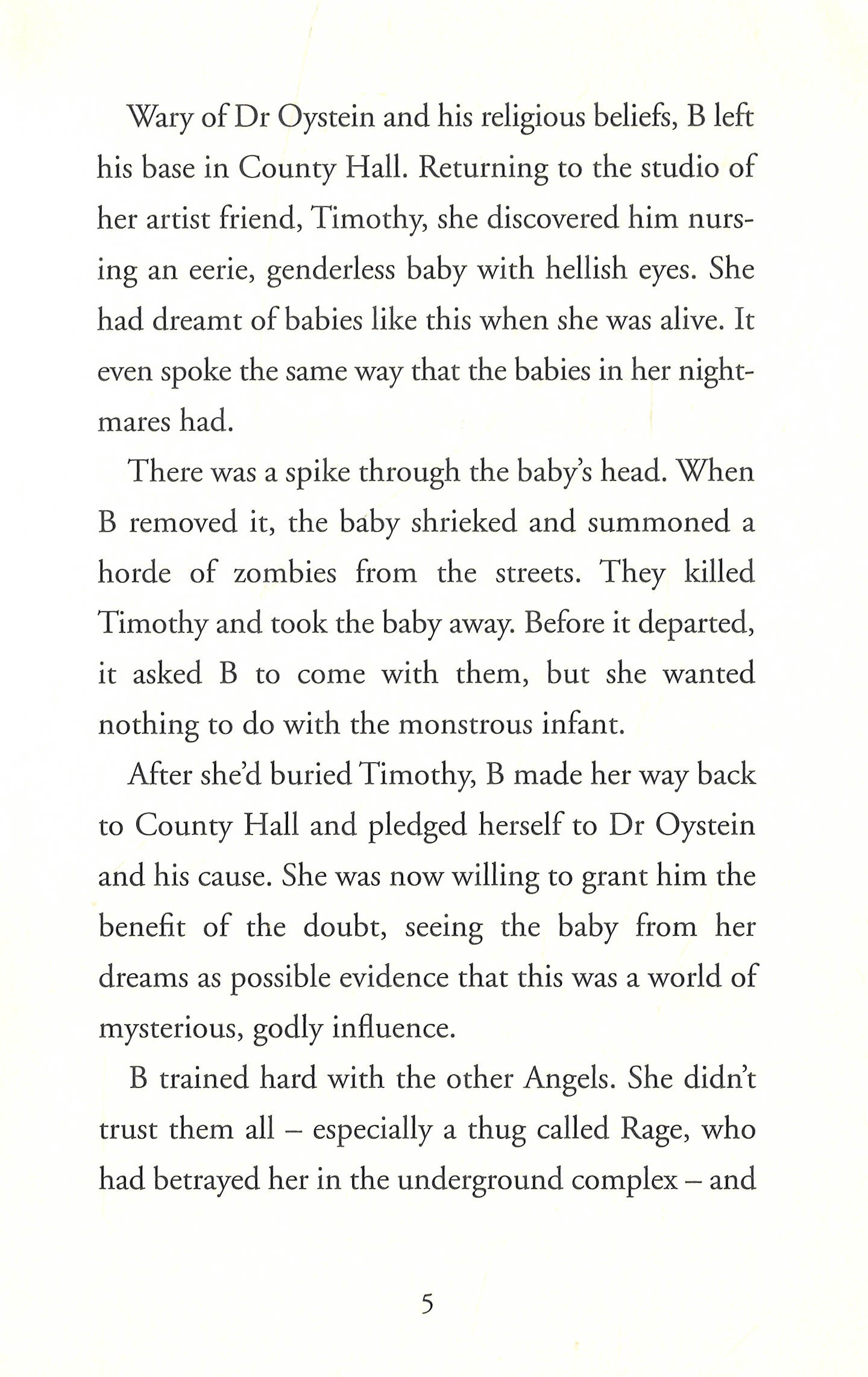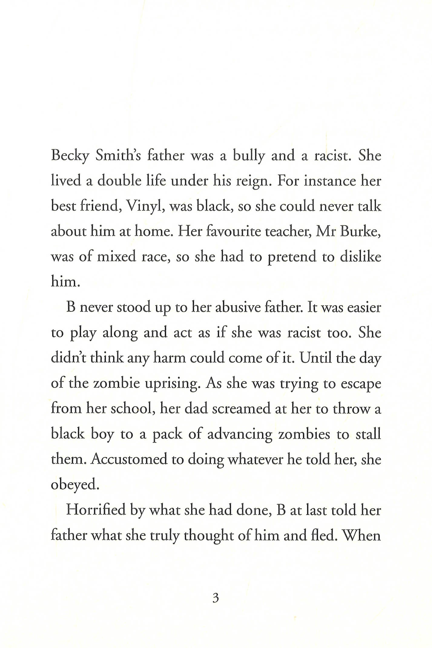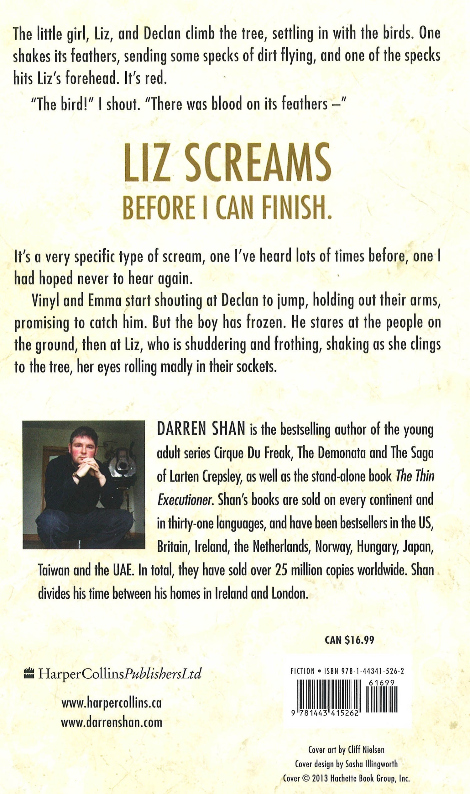 The little girl, Liz, and Declan climb the tree, settling in with the birds. One shakes its feathers, sending some specks of dirt flying, and one of the specks hits Liz's forehead. It's red. "The bird!" I shout. "There was blood on its feathers - " Liz screams before I can finish. It's a very specific type of scream, one I've heard lots of times before, and one I had hoped to never hear again. Vinyl and Emma start shouting at Declan to jump, holding out their arms, promising to catch him. But the boy has frozen. He stares at the people on the ground, then at Liz, who is shuddering and frothing, shaking as she clings to the tree, her eyes rolling madly in their sockets.