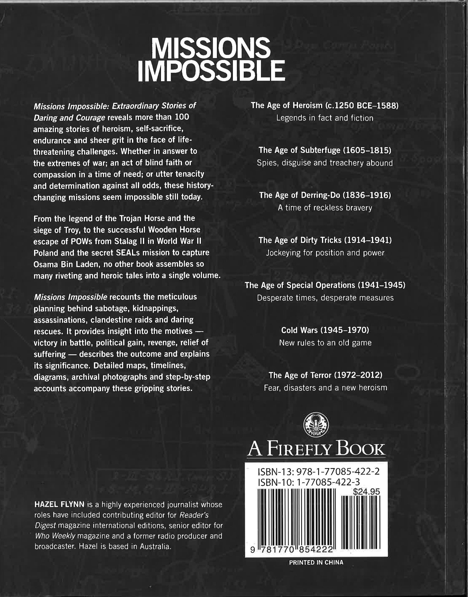 110 incredible true stories torn from the pages of history. From Ancient Greece to the hunt and killing of Bin Laden, here are incredible acts of bravery, courage and derring-do that have in one fell swoop changed the world. Missions Impossible: Extraordinary Stories of Daring and Courage is a fascinating encyclopedia of 110 such stories from around the world. More than 300 photographs and illustrations highlight the brief text, which describes the events chronologically. A summary list notes the Date, Location, Objective, and Forces or People involved. A timeline and maps together show the events step by step. These are the stories burned in our memory, but do we know what really happened? And the incredible courage they took? The stories include: Age of Heroism Hannibal crossing the Alps Battle of Agincourt Siege of Tenochtitlan Defeat of the Spanish Armada Age of Subterfuge Gunpowder Plot Escape of Charles II Captain Morgan's raid on Panama Burning of the White House Age of Derring- Do The Alamo Charge of the Light Brigade Battle of Maiwand, Afghanistan Seige of Khartoum Age of Dirty Tricks Pancho Villa's raid on USA Raid on Glenwitz radio station Assassination of Trotsky Human Torpedo attack: Alexandria Special Operations Attempted assassination of Rommel Rescue of Mussolini "The Wooden Horse": POW camp Clandestine navigation for D- Day Cold Wars Enola Gay The Berlin Airlift U-2 Incident: Gary Powers Battle of Dien Bien Phu The Age of Terror Attempted rescue: US hostages, Iran Black Hawk Down: Mogadishu 9/11 attacks Russian submarine: Kamchatkha Tracking down Bin Laden. This is an exciting book for readers of war, history, and espionage.