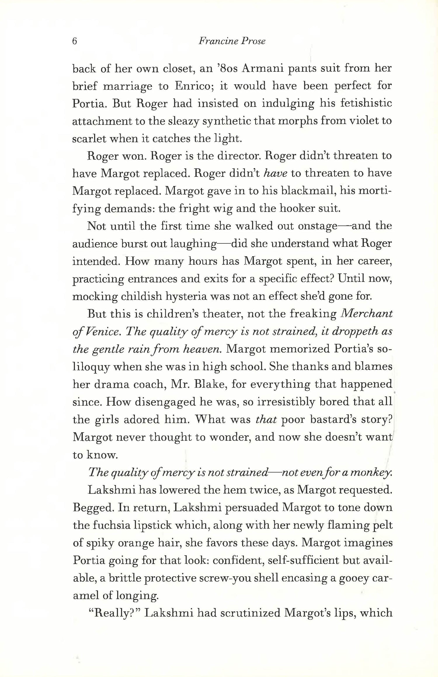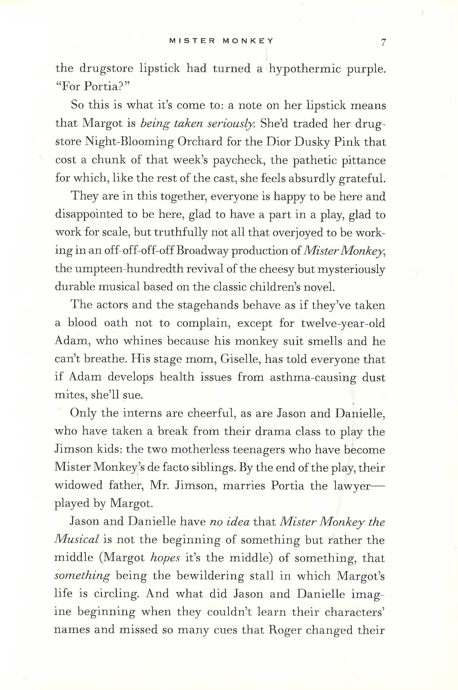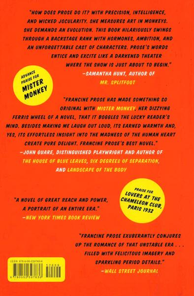 The acclaimed New York Times bestselling author weaves an ingenious, darkly humorous, and brilliantly observant story that follows the exploits and intrigue of a constellation of characters affiliated with an off-off-off-off Broadway children's musical. Mister Monkey-a screwball children's musical about a playfully larcenous pet chimpanzee-is the kind of family favorite that survives far past its prime. Margot, who plays the chimp's lawyer, knows the production is dreadful and bemoans the failure of her acting career. She's settled into the drudgery of playing a humiliating part-until the day she receives a mysterious letter from an anonymous admirer ...and later, in the middle of a performance, has a shocking encounter with Adam, the twelve-year-old who plays the title role. Francine Prose's effervescent comedy is told from the viewpoints of wildly unreliable, seemingly disparate characters whose lives become deeply connected as the madcap narrative unfolds. There is Adam, whose looming adolescence informs his interpretation of his role; Edward, a young audience member who is candidly unimpressed with the play; Ray, the author of the novel on which the musical is based, who witnesses one of the most awkward first dates in literature; and even the eponymous Mister Monkey, the Monkey God himself. With her trademark wit and verve, Prose delves into humanity's most profound mysteries: art, ambition, childhood, aging, and love. Startling and captivating, Mister Monkey is a breathtaking novel from a writer at the height of her craft.
