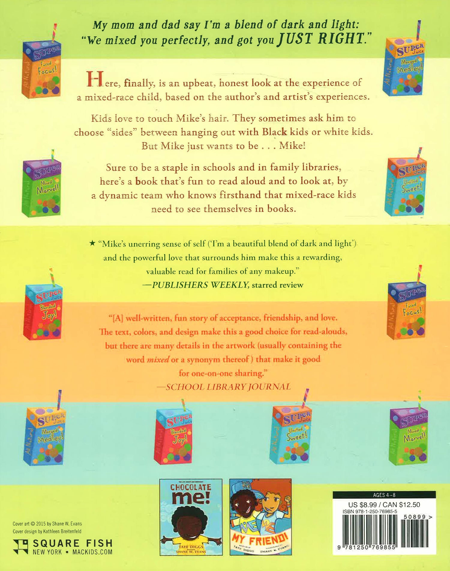Mum and Dad say I'm a blend of dark and light: 'We mixed you perfectly, and got you just right.' Here, finally, is an upbeat, honest look at the experience of a mixed-race child, based on the author's and artist's experiences. Kids love to touch Mike's hair. They sometimes ask him to choose 'sides' between hanging out with black kids or white kids. But Mike just wants to be . . . Mike!
