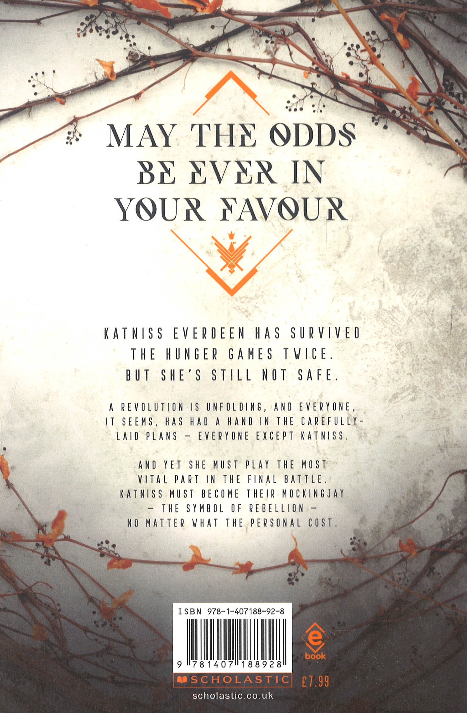 Against all odds, Katniss Everdeen has survived the Hunger Games twice. But now that she's made it out of the bloody arena alive, she's still not safe. The Capitol is angry. The Capitol wants revenge. Who do they think should pay for the unrest? Katniss. And what's worse, President Snow has made it clear that no one else is safe either.Against all odds, Katniss Everdeen has survived the Hunger Games twice. But now that she's made it out of the bloody arena alive, she's still not safe. The Capitol is angry. The Capitol wants revenge... The thrilling final instalment of this ground-breaking trilogy promises to be one of the most talked-about books of the year.