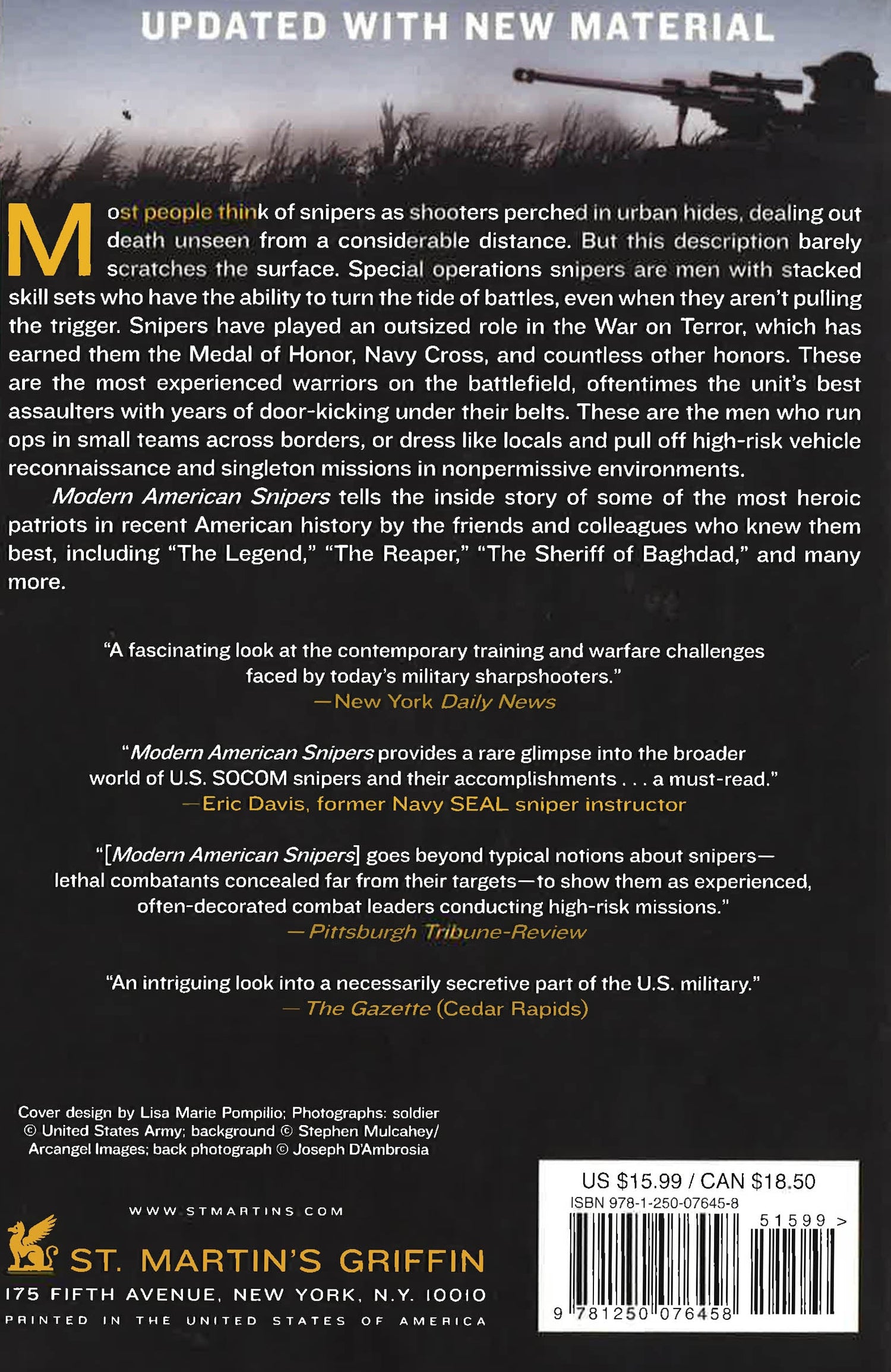 Most people think of snipers as shooters perched in urban hides, dealing out death unseen from a considerable distance. But this description barely scratches the surface. Special operations snipers are men with stacked skill sets who have the ability to turn the tide of battles, even when they aren't pulling the trigger. Snipers have played an outsized role in the War on Terror that has earned them the Medal of Honor, Navy Cross, and countless other honors. These are the most experienced warriors on the battlefield, often times the units' best assaulters with years of door-kicking under their belt. These are the men who run ops in small teams across borders, or dress like locals and pull off high-risk vehicle reconnaissance and singleton missions in non-permissive environments. MODERN AMERICAN SNIPERS tells the inside story of some of the most heroic patriots in recent American history by the friends and colleagues who knew them best.