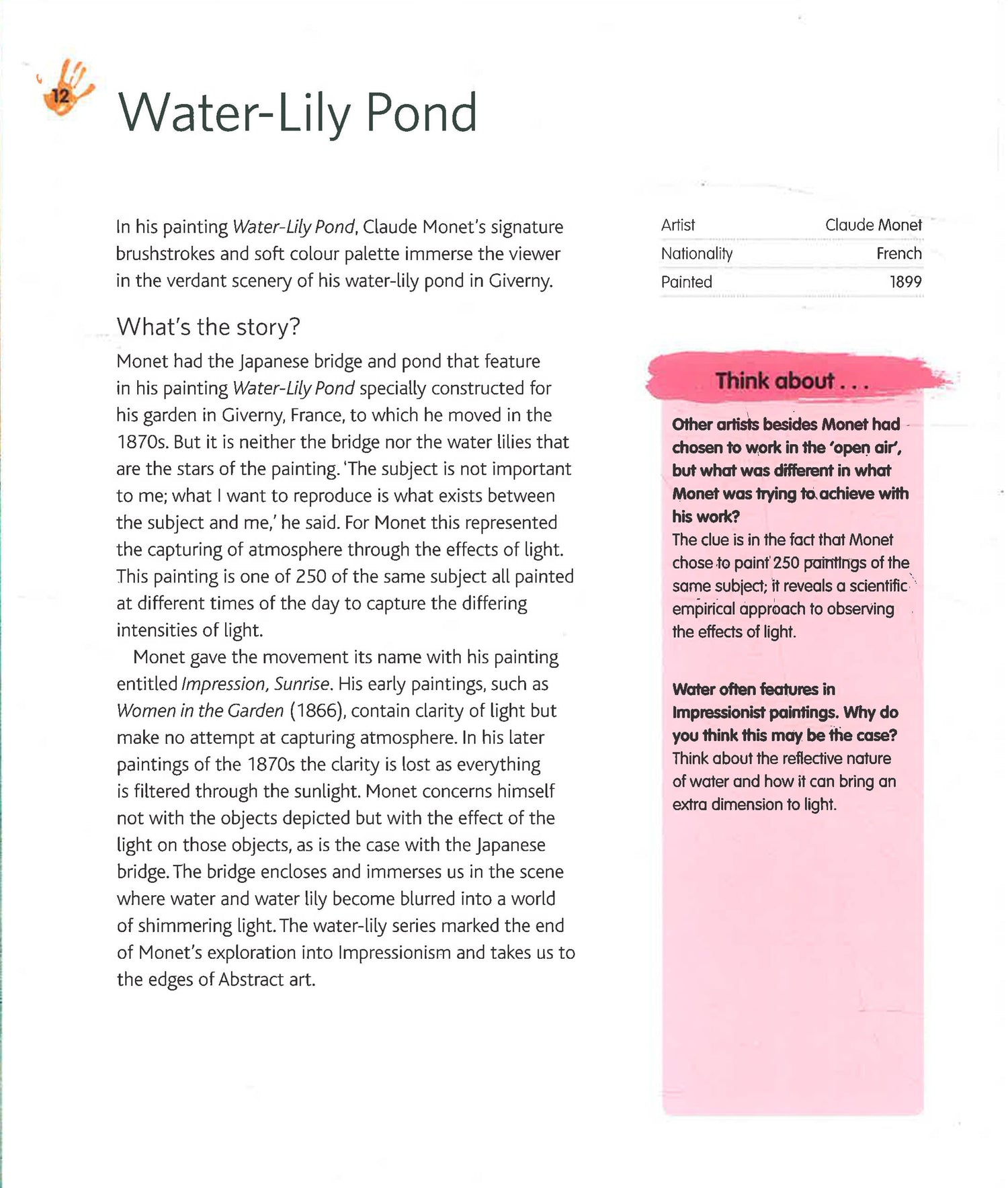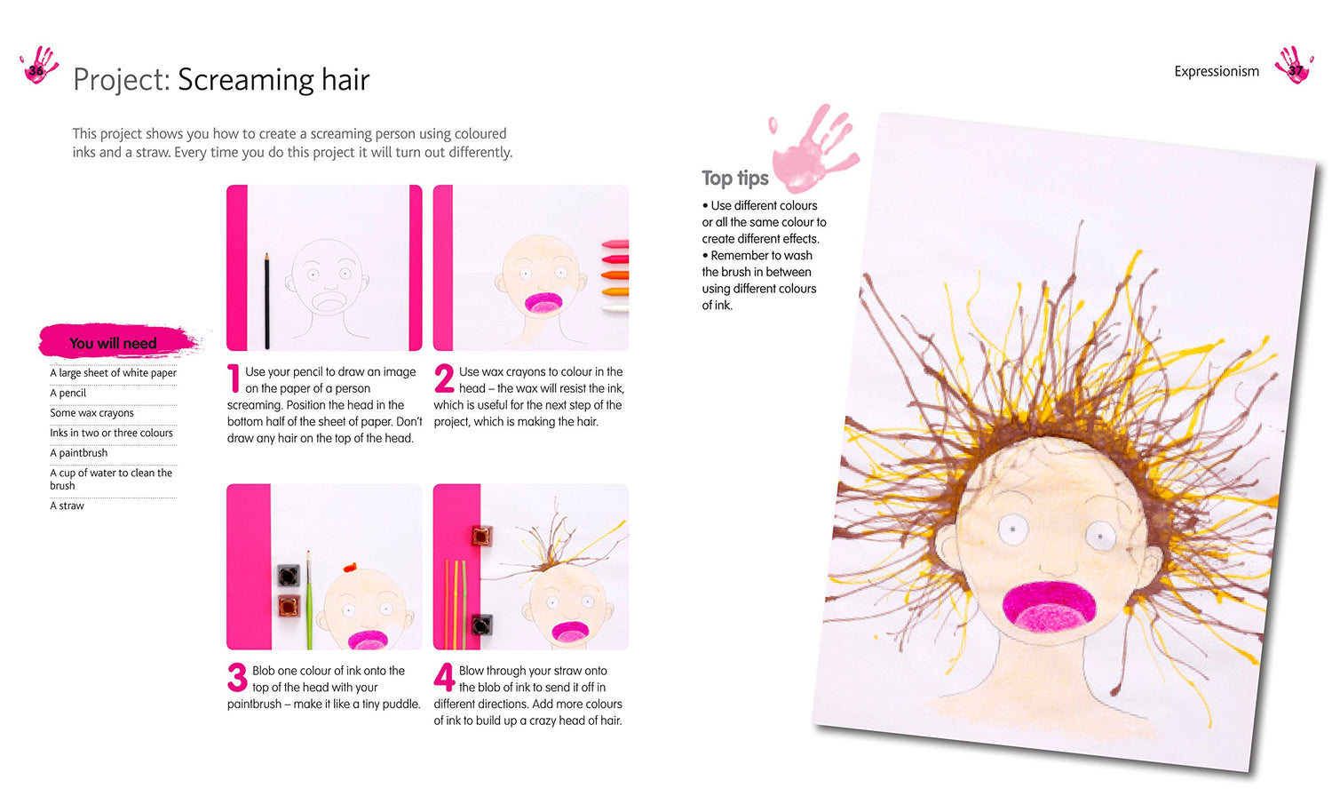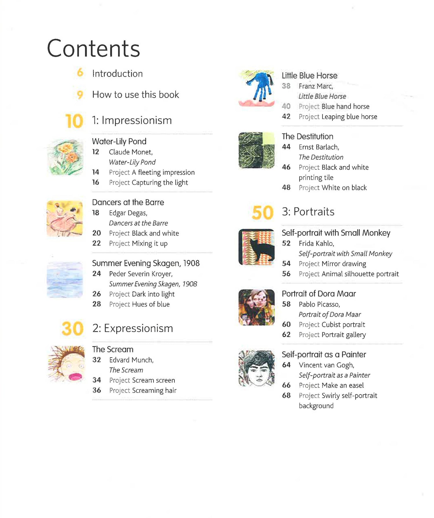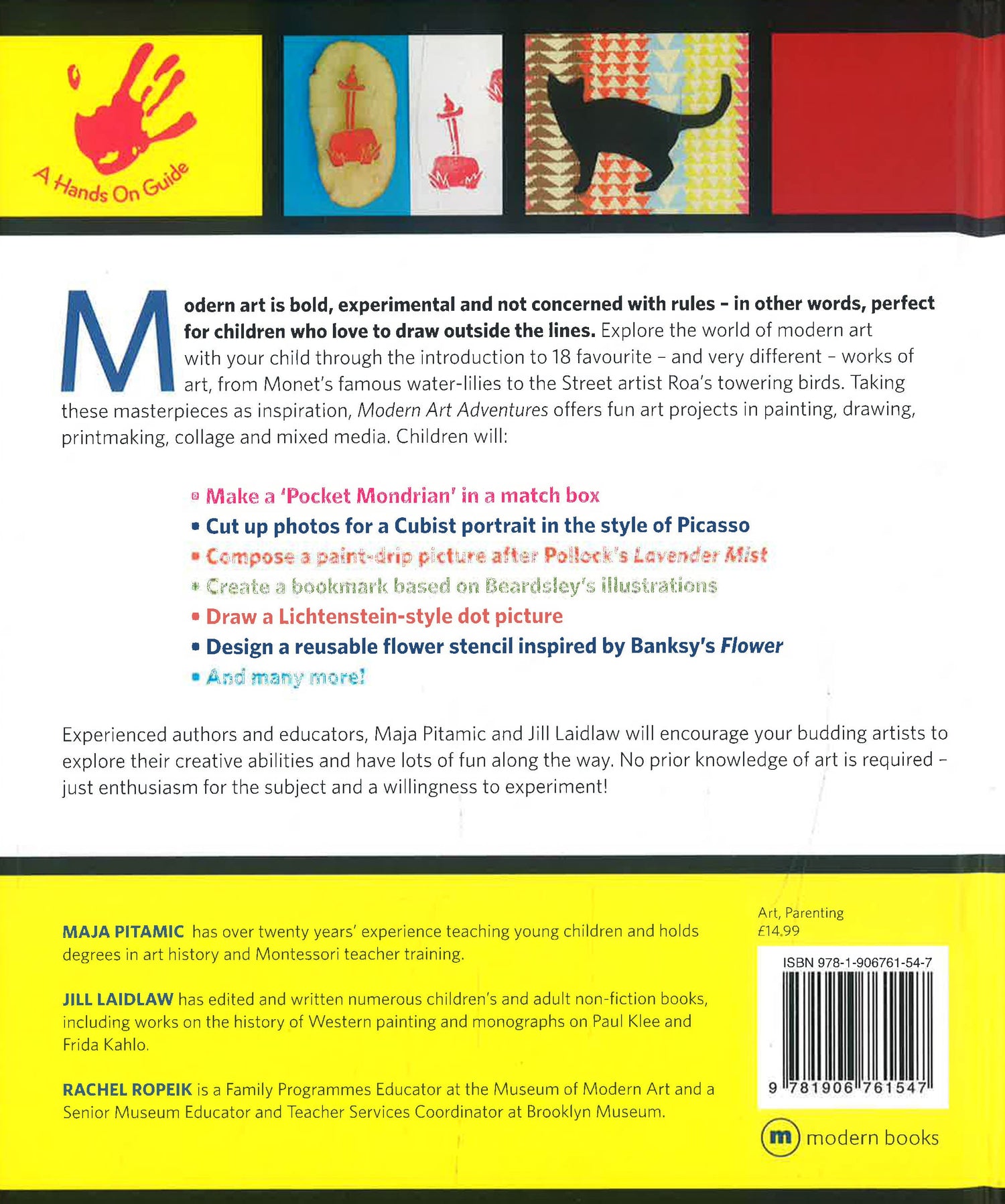 Inspire and share with your child the wonderful world of creativity with Modern Art Adventures . Authors Jill Laidlaw and Maja Pitamic explore the stories behind 18 masterpieces of modern art and use them as inspira tion for children to create their own exciting and creative art projects with a diverse range of media. The book is divided by the most significant artistic movements of the past century – Impressionism, Expressionism, Abstract, Illustration, Pop Art and S treet Art – and each masterpiece is accompanied by the story of its significance and two step -by- step art activities that are inspired by its techniques and visual effects.