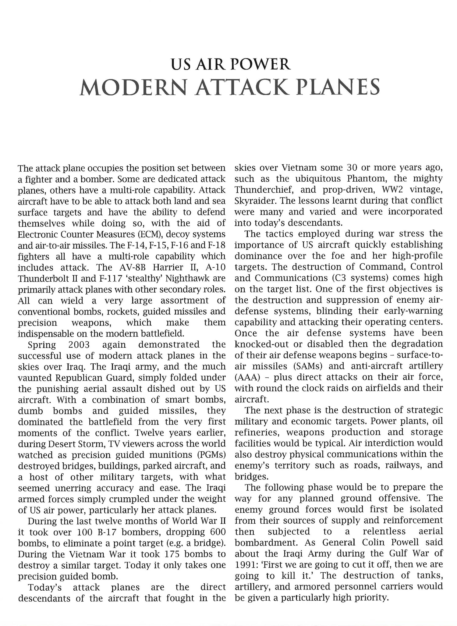 The US Air Power series is the definitive illustrated guide to recent American dominance in the skies. Covering the planes and crews of the USAF as well as Naval, Marine and Army air wings, these books cover a period from World War II through to the present day in which American pilots have prevailed in all combat situations and have laid the foundation for the swift and decisive victories achieved during that time. The 72 pages include well over 110 photographs, 16 pages of which are in colour, and every photo has a detailed caption outlining combat histories and technical specification. The series will cover all the major conflicts in which the US has been involved recently including both Gulf Wars, the Balkans and Afghanistan. Modern Attack Planes features the aircraft and weapons that contribute to dominance on the battlefield; aircraft such as the F-117 'Stealth', the A-10 'Tankbuster' and the AV-8B Harrier II, as well as a selection of the vast array of weaponry they are capable of carrying including laser-guided bombs, anti-ship and close air support missiles, JDAM and many others. Anthony A. Evans has been publishing books on military matters for over 20 years. His most recent is The Gulf War in the GI Series. Other books in the series will include: Modern Air Superiority Planes Modern Bombers Modern Electronic and Surveillance Planes Airwar over the Gulf I Airwar over the Gulf II The Balkans Afghanistan - Operation Enduring Freedom