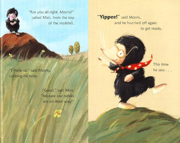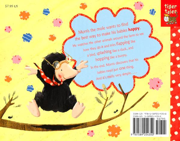 After observing how other animals around the farm make their new offspring happy, an expectant father mole flaps llike a bird, splashes like a duck, and hops like a bunny until he discovers that his babies need just one thing--love.