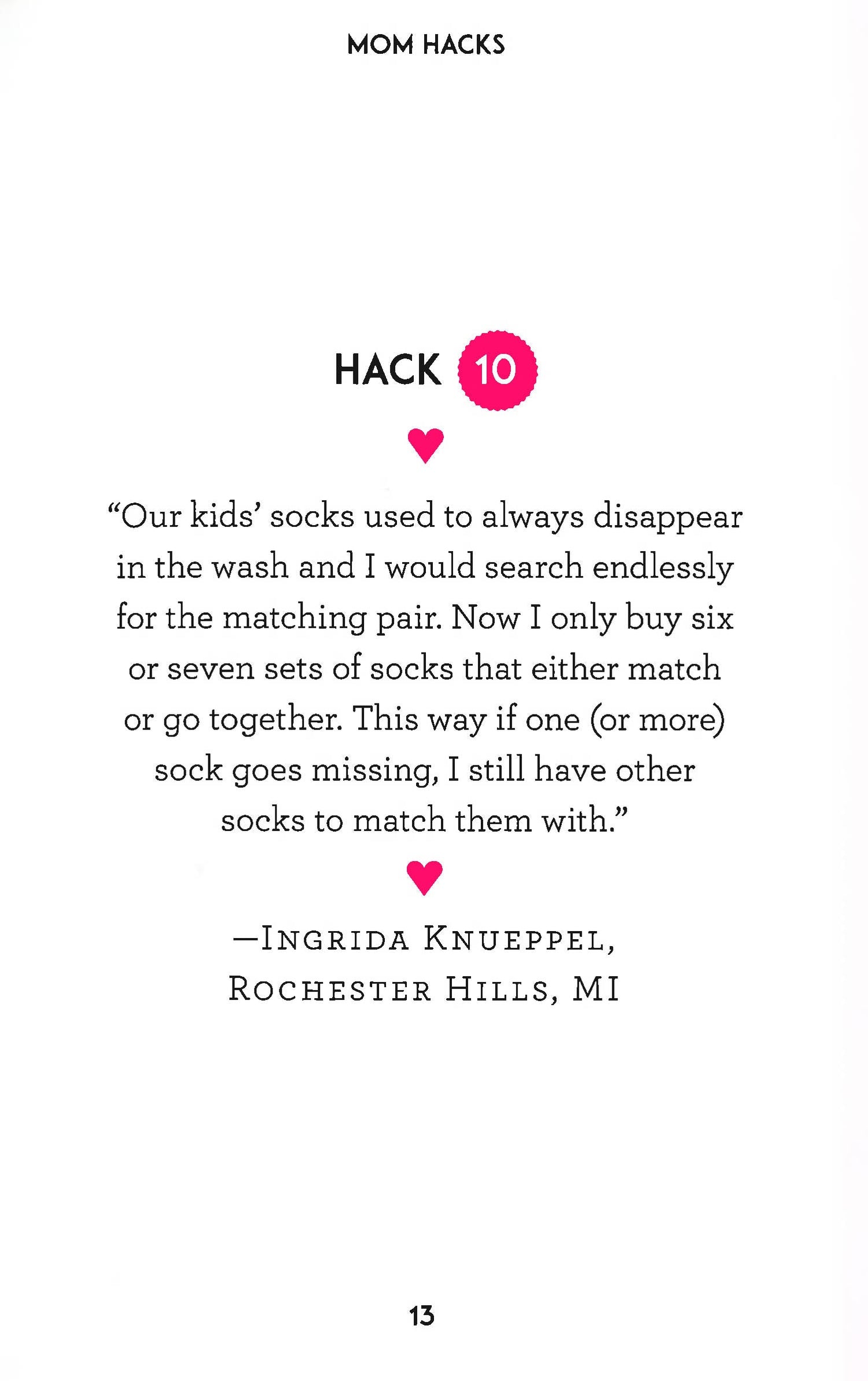 Mom Hacks contains more than 150 mom hacks from real moms to help make your life a little easier and your time (kid-free or with kids) more manageable and, dare we say it, more productive (and maybe a little more fun!).
