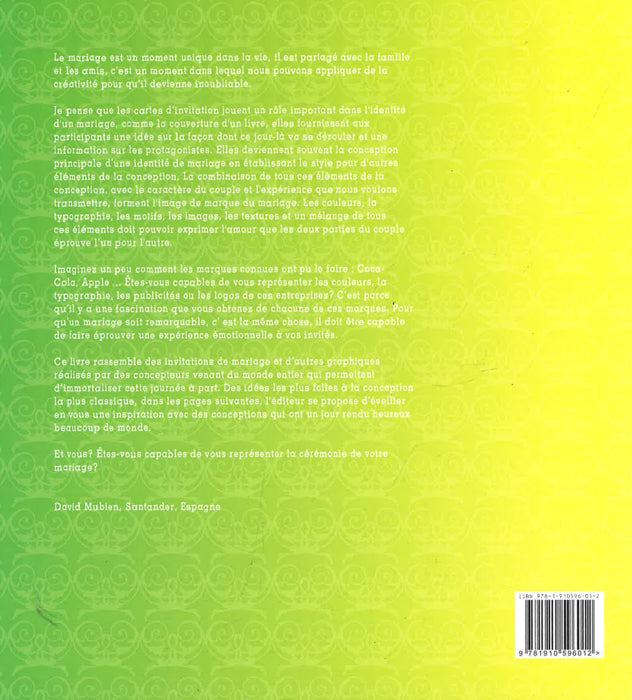 Weddings are a unique moment in life, shared with family and friends, a moment in which we can apply creativity to make it unforgettable. I think that invitation cards play an important role in the identity of a wedding, like the cover of a book, they provide attendees with an idea about how that day will unfold and information about the protagonists. They often become the main design of a wedding identity by establishing the style for other design elements. The combination of all these design elements, along with the character of the couple and the experience we want to convey, form the branding of the wedding. Colors, typography, patterns, images, textures and a mixture of all these elements should be able to express the love that both parties of the couple feel for each other. Imagine how well-known brands have done it: Coca-Cola, Apple... Are you able to imagine the colors, typography, advertisements, or logos of these companies? That's because there's a fascination you get from each of these brands. For a wedding to be remarkable, it's the same thing; it must be able to create an emotional experience for your guests. This book brings together wedding invitations and other graphics created by designers from all over the world that allow you to immortalize this special day. From the craziest ideas to the most classic designs, in the following pages, the publisher aims to inspire you with designs that have once made many people happy. And you? Can you imagine your wedding ceremony?