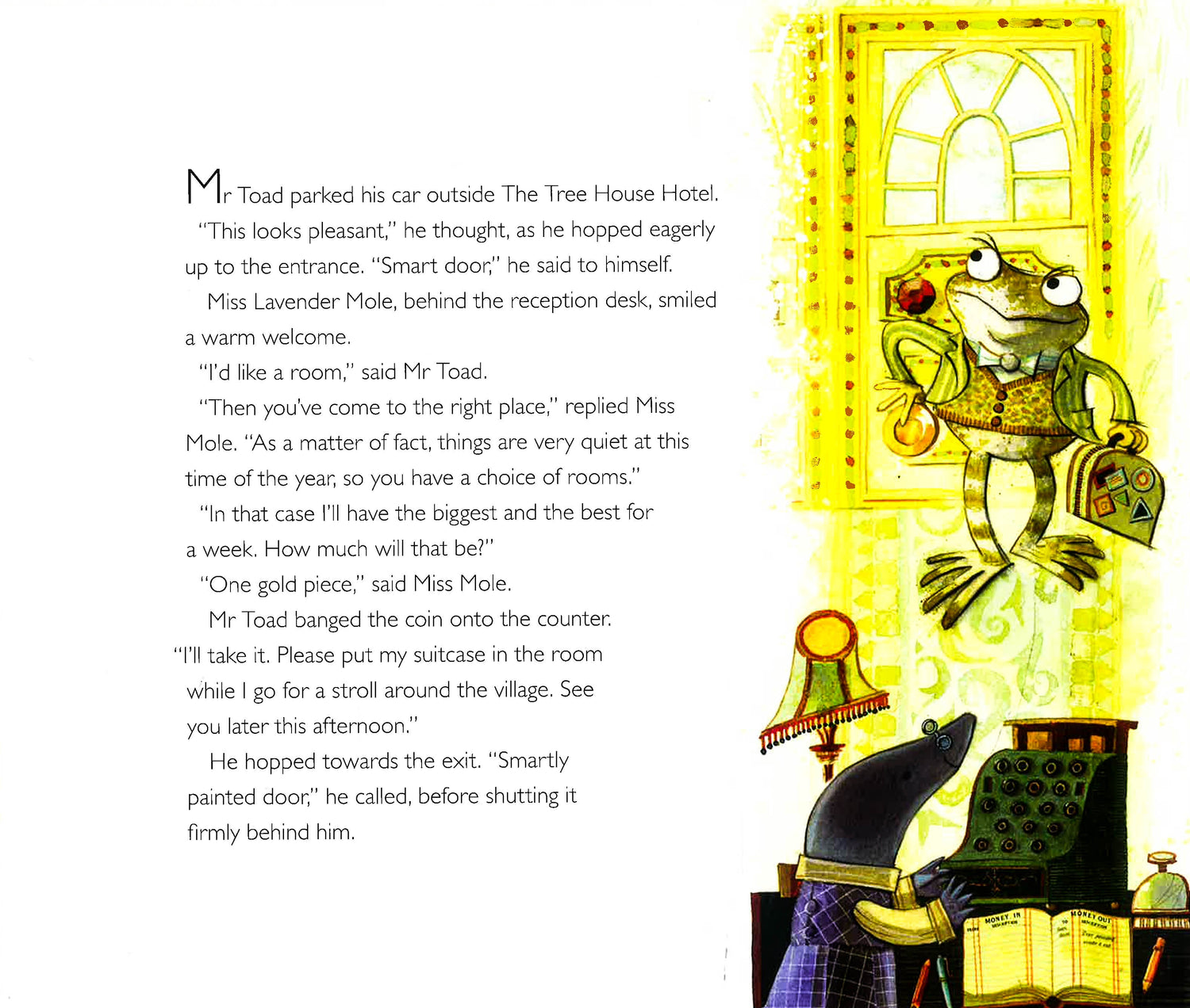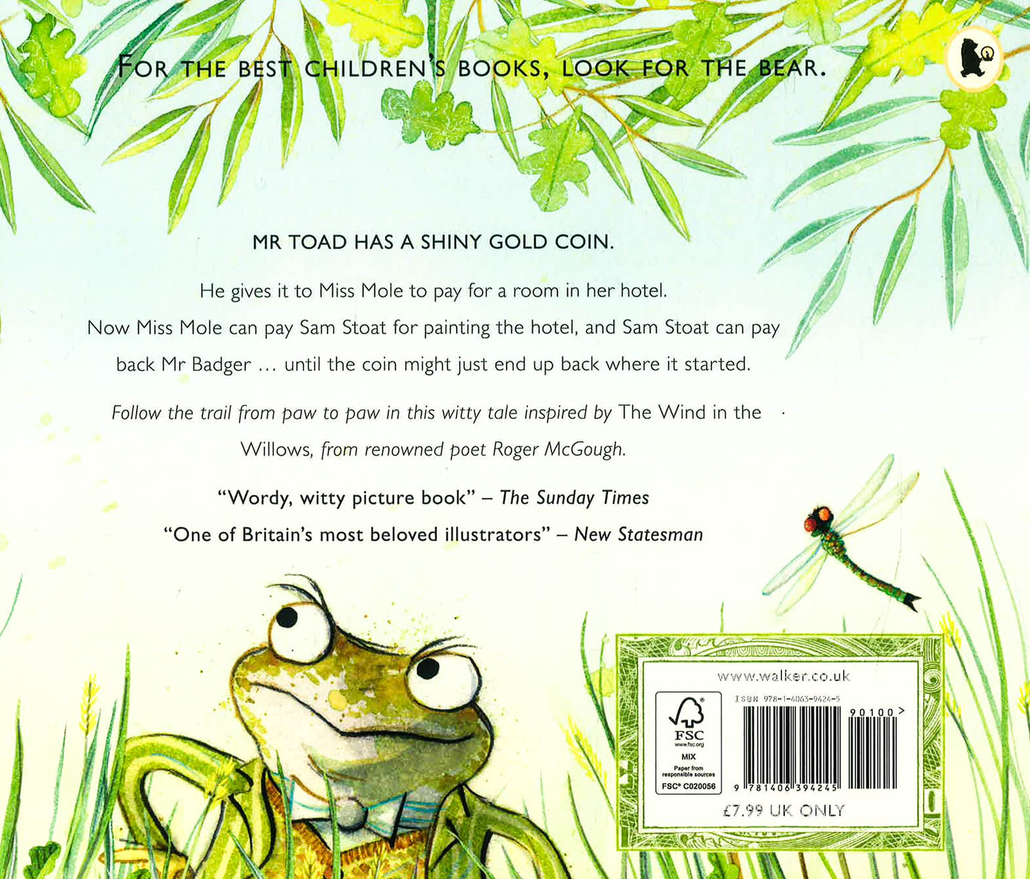 Mr Toad has a shiny gold coin. He gives it to Miss Mole to pay for a room in her hotel. Now Miss Mole can pay Sam Stoat for painting the hotel, and Sam Stoat can pay back Mr Badger ... until the coin might just end up back where it started! From renowned poet Roger McGough and Kate Greenaway Medal winner Mini Grey, this is an inspired and witty tale featuring beloved characters from The Wind in the Willows.