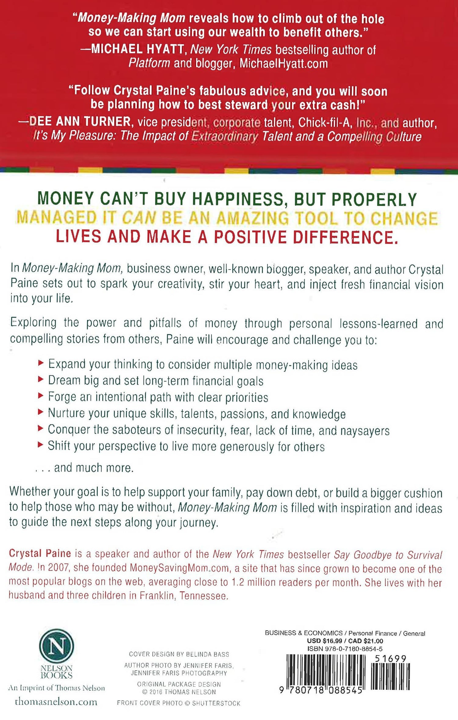 Entrepreneur, author, and popular blogger Crystal Paine shares the secrets of building income at home, using real life examples from her own journey in becoming a money-making mom as well as the stories of other women from all walks of life. The nuts and bolts of how to make more money from home are revealed in clear steps that can be immediately and easily put into practice.