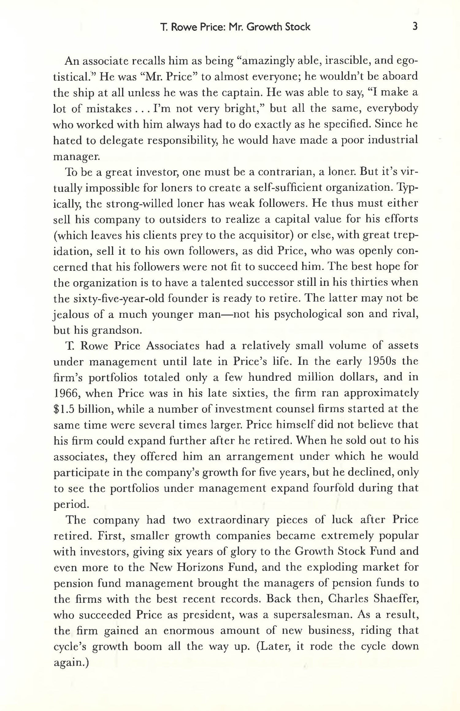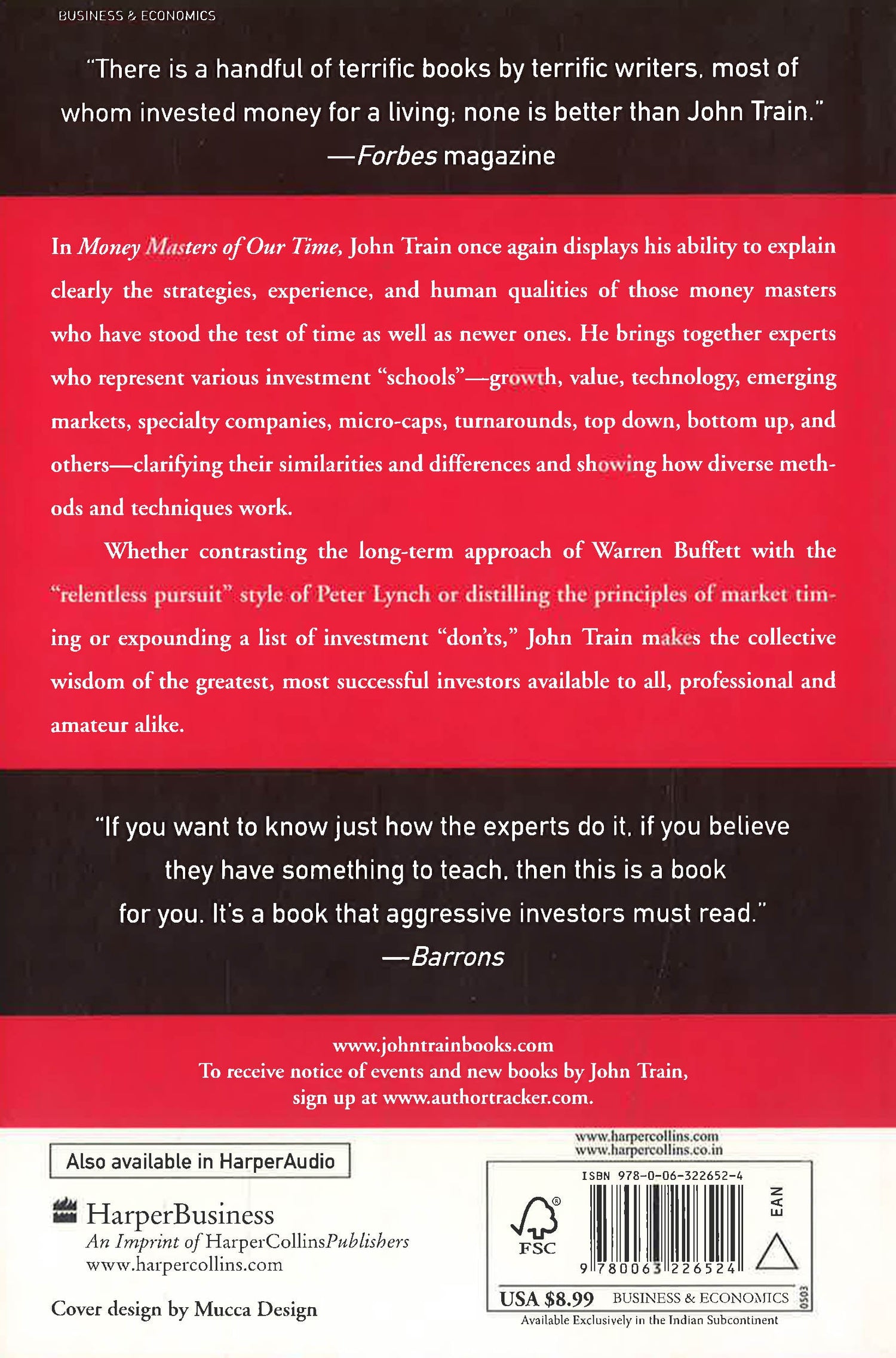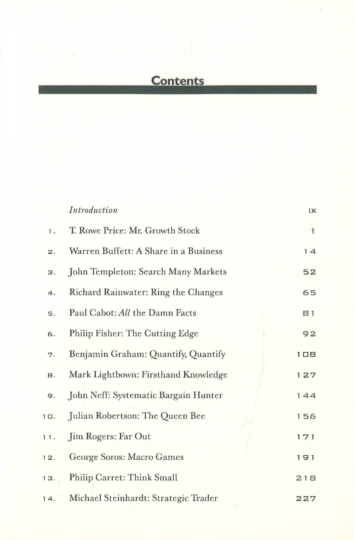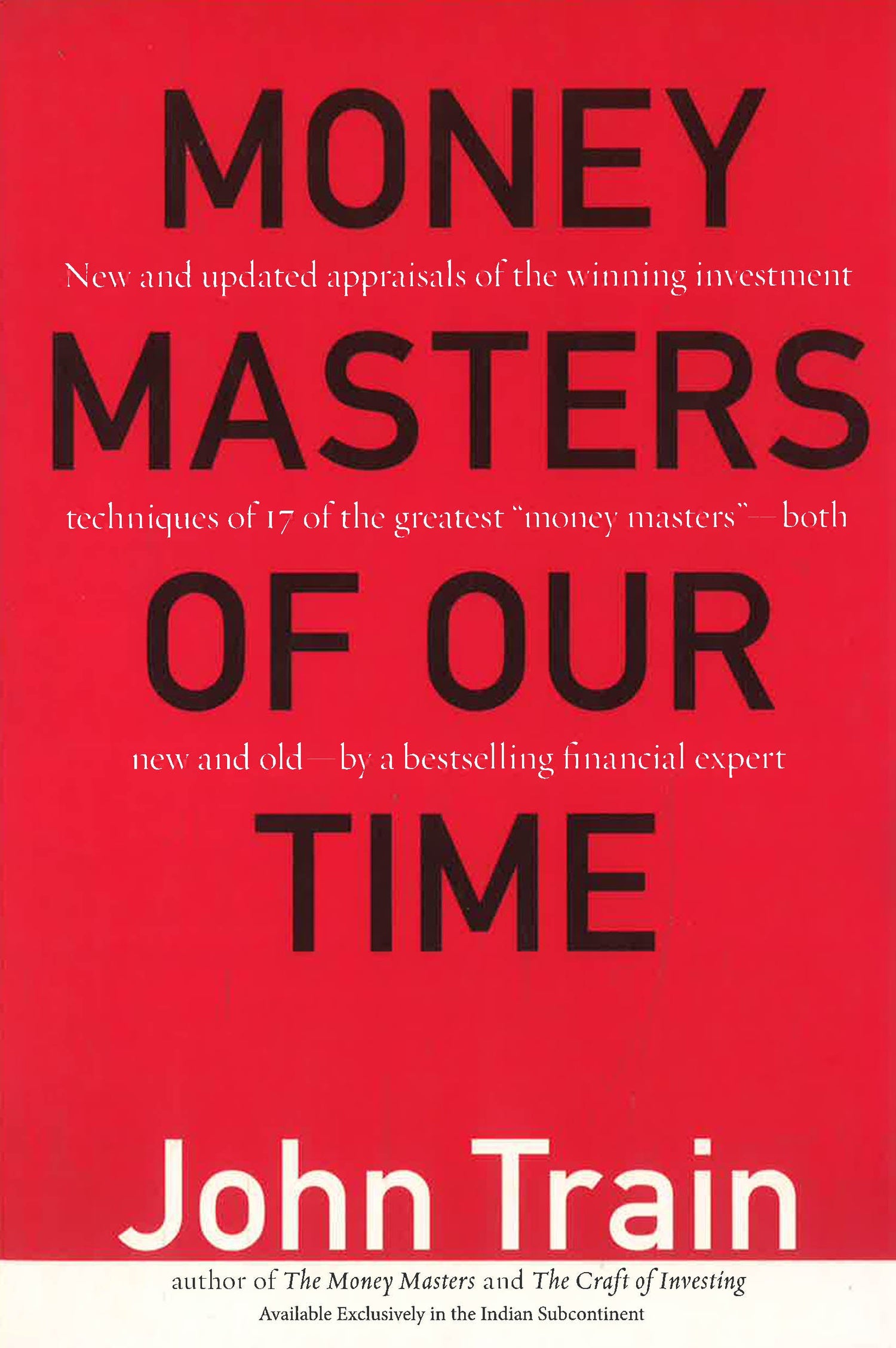 The ′Money Masters′ covered are: Warren Buffet, Paul Cabot, Philip Carret, Philip Fisher, Benjamin Graham, Mark Lightbrown, Peter Lynch, John Neff, T. Rowe Price, Richard Rainwater, Julian Robertson, Jim Rogers, George Soros, Michael Steinhardt, John Templeton, Ralph Wanger, Robert Wilson. Train centres on their investment techniques and methods and also gives brief biographical evaluations.