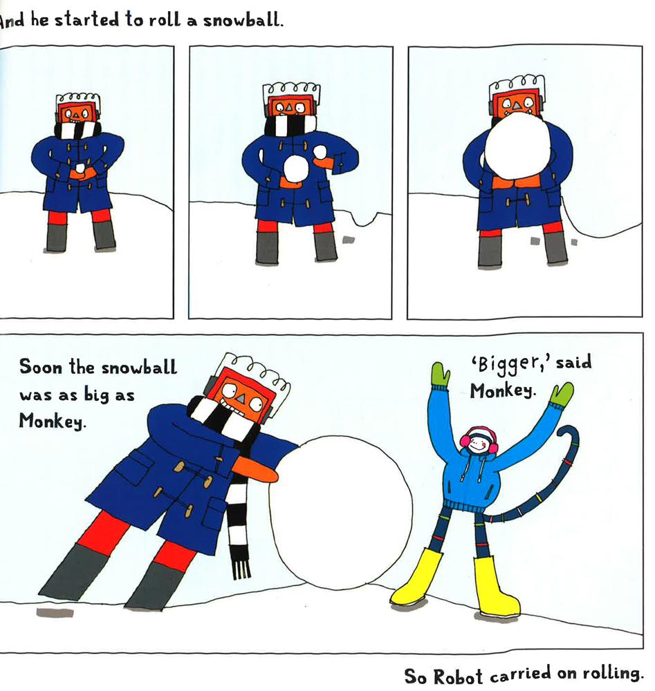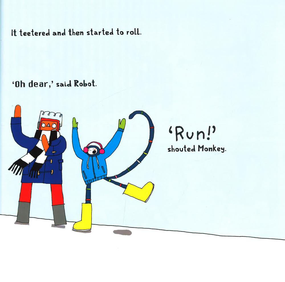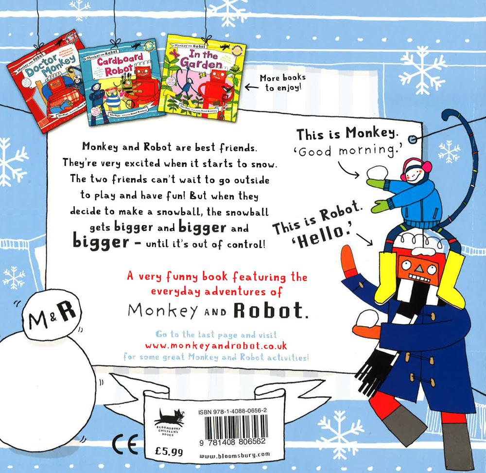 In this fourth book in the Monkey and Robot series, Monkey and Robot are very excited when it starts to snow. Of course they cannot resist going out to play and have fun. But when they start making a snowball, the snowball becomes bigger and bigger and BIGGER until it is out of control! Monkey and Robot end up rather wet and snowy, but a big mug of hot chocolate helps to cheer them up.