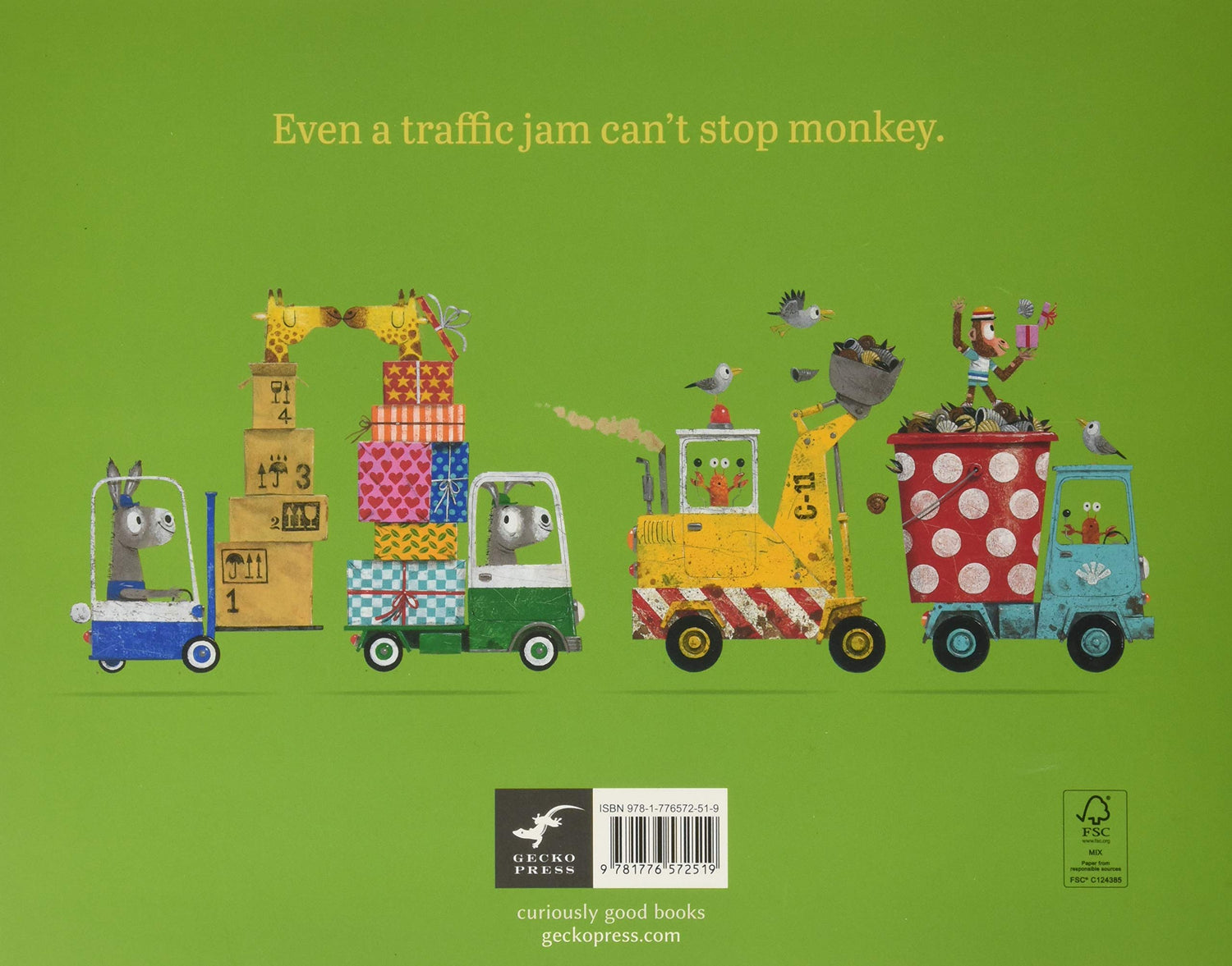 Papa Monkey and Little Monkey are on their way. But the street is very busy and they are moving so slowly! Little Monkey loses patience and jumps onto the fire engine. Up the ladder from there and he joins a TV crew! Then the garbage truck, an aquarium bus, a food cart for rabbits packed with carroty treats, Arctic animals traveling by snow globe, a jewel thief's getaway car . . .