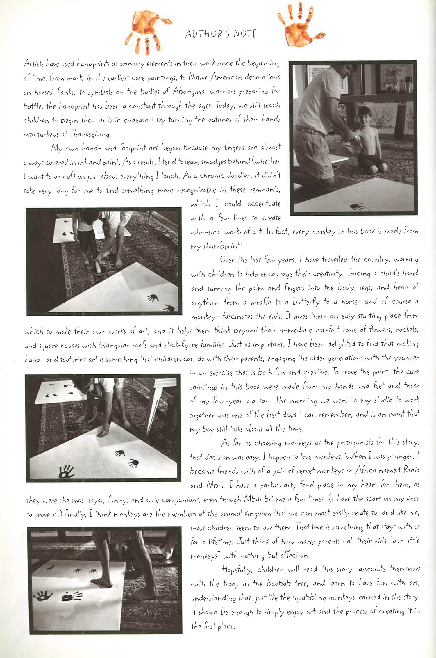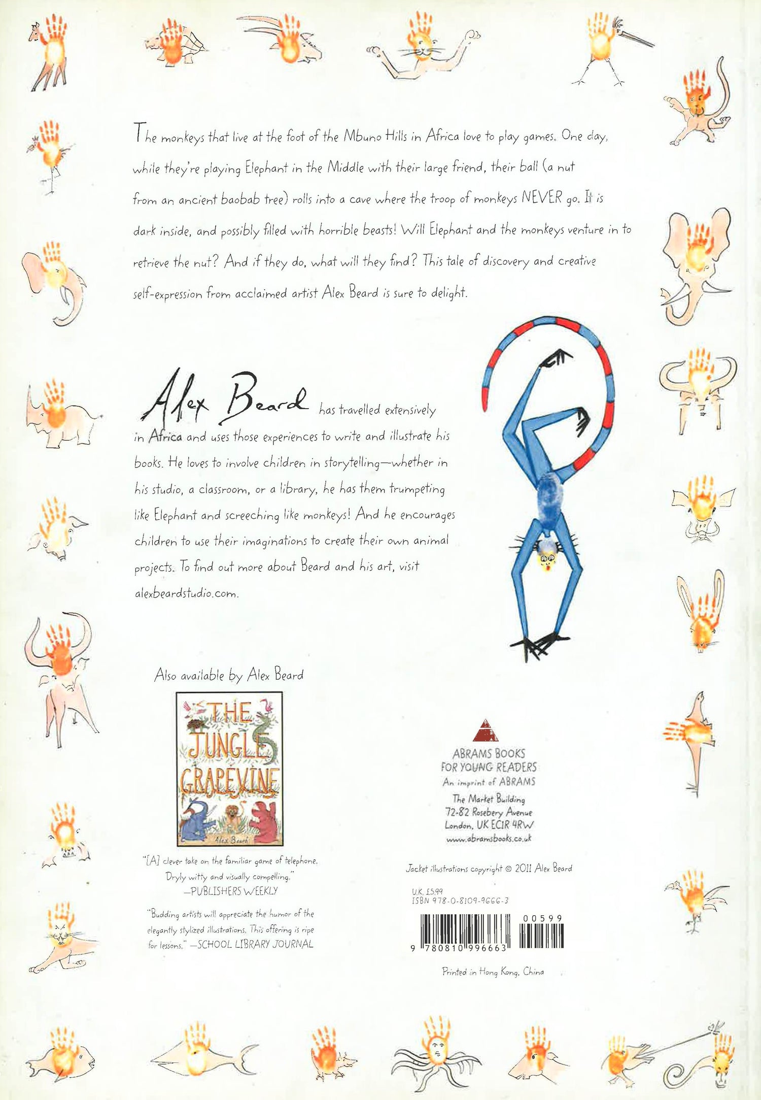 At the foot of the Mbuno Hills in Africa lies a mysterious, dark cave that a troupe of monkeys never venture into. One day while playing a game with Elephant, their rare nut from an ancient baobab tree rolls into the cave. The cave, they come to find out, is covered in paintings, so they begin to create their own masterpieces with mud. But then they squabble over whose painting was the best. Who won the game? Elephant has a different way of looking at it: "It's not a game to win or lose. Just have fun." The monkeys soon join Elephant in drawing and painting just for fun, and no longer fear the painted cave.