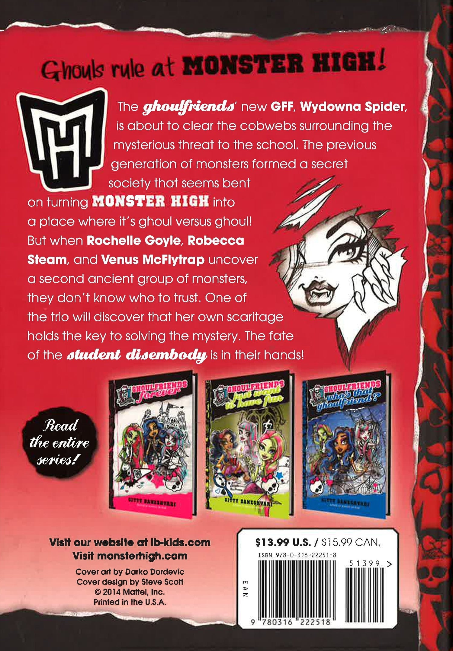 The ghoulfriends' new GFF, Wydowna Spider, starts to clear the cobwebs about the mysterious threat to Monster High. The previous generation of monsters formed a secret society that seems bent on turning the school into something that's more like a prison! But when Rochelle Goyle, Robecca Steam, and Venus McFlytrap uncover a second ancient group of monsters...the fate of the student disembody is in their hands!