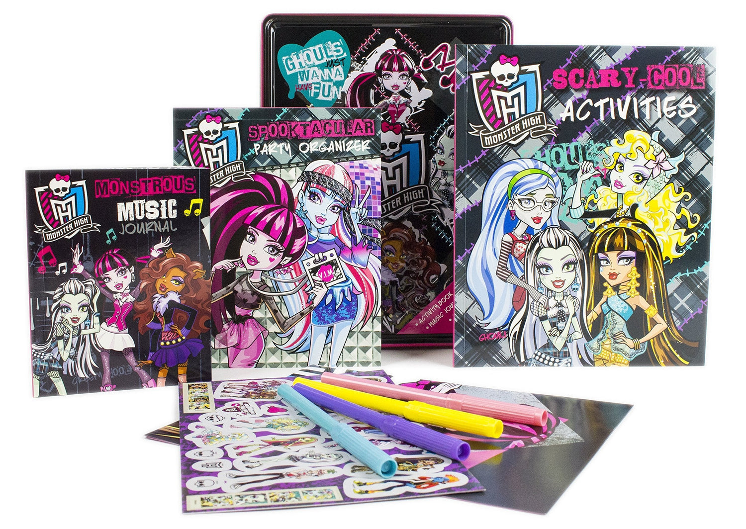 Monster High is in session! Collectable embossed tin containing: Fang-tastic Double-sided Poster and Pens, 50 Freaky Fab Stickers, Clawsome Activity Book, Party Organiser and Music Journal.