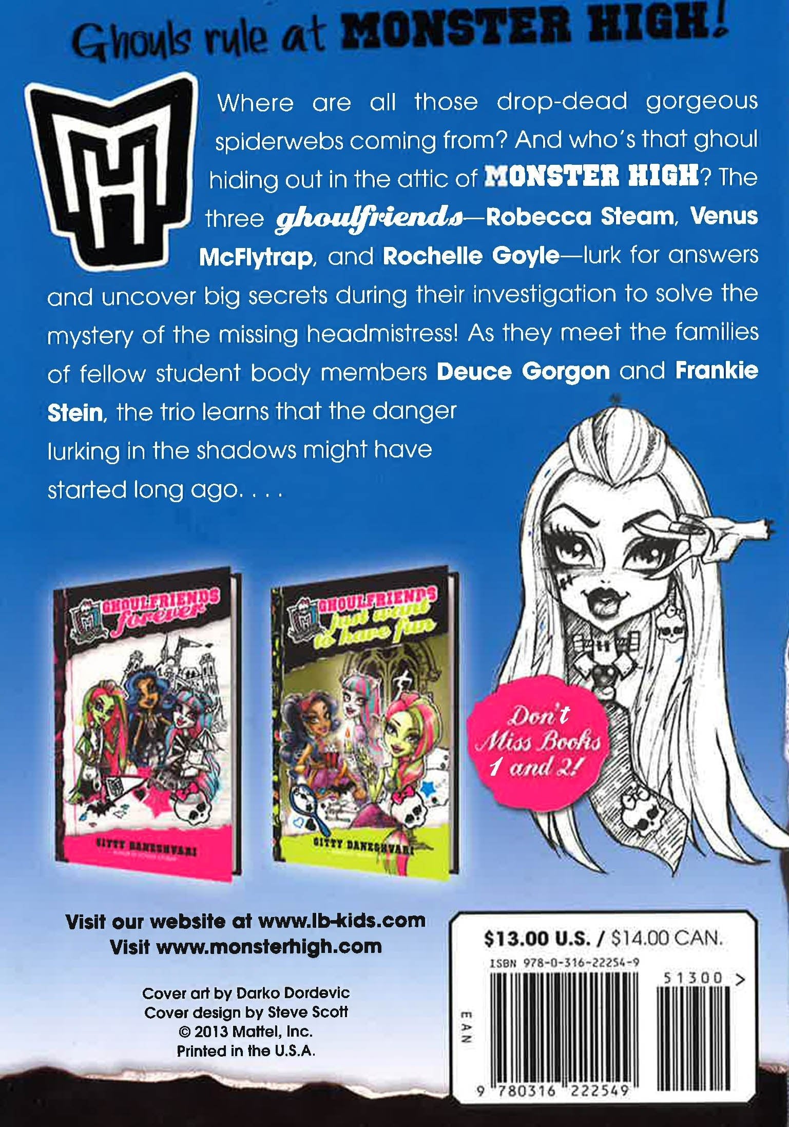 The three ghoulfriends, Robecca Steam, Venus McFlytrap, and RochelleGoyle, are on the case to solve the mystery of the missing headmistress! First up is investigating the creeperiffic attic on the Monster High campus, where someone appears to have been hiding out amongst the lacy webs! Who is she, and what's her secret? The ghoulfriends soon find out and uncover a much bigger plot that puts the future of the entire student body in danger!
