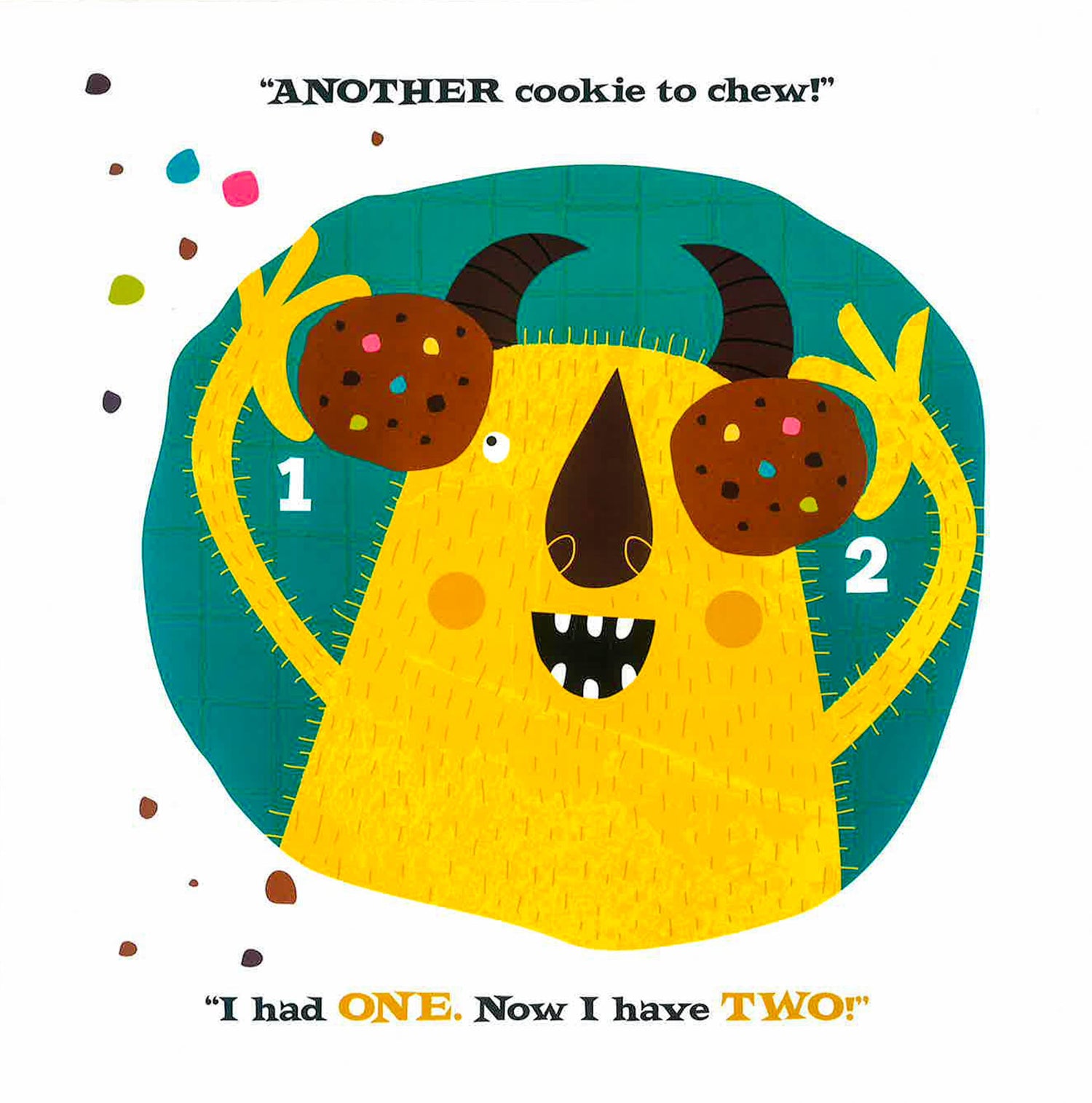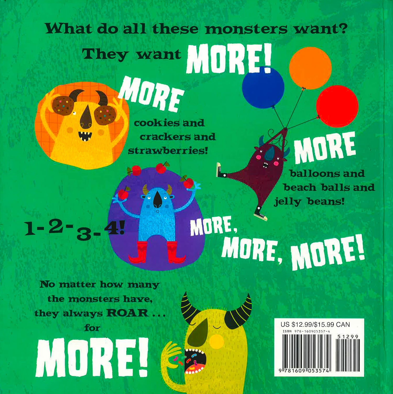 More is better! Natalie Marshall's goofy monsters made their debut in a book about monsters and manners Monster Be Good! This time, it's monsters and math, as every monster-member of this funny, grumpy, not-too-scary gang counts jelly beans, teddy bears, apples, donuts, toys, and even kisses. What do they all have in common? They all want ONE MORE! As each monster gets his wish, kids can chime in with the new number that ONE MORE adds up to. When the next-to-last monster gets TEN goodnight kisses, ONE mom-ster hug is just enough to cap off this tale of merry monster-math! Entertaining as it educates, Monster Needs One More! offers a perfect primer for introducing preschoolers to counting and addition. Who could ask for more?