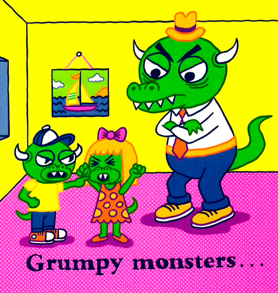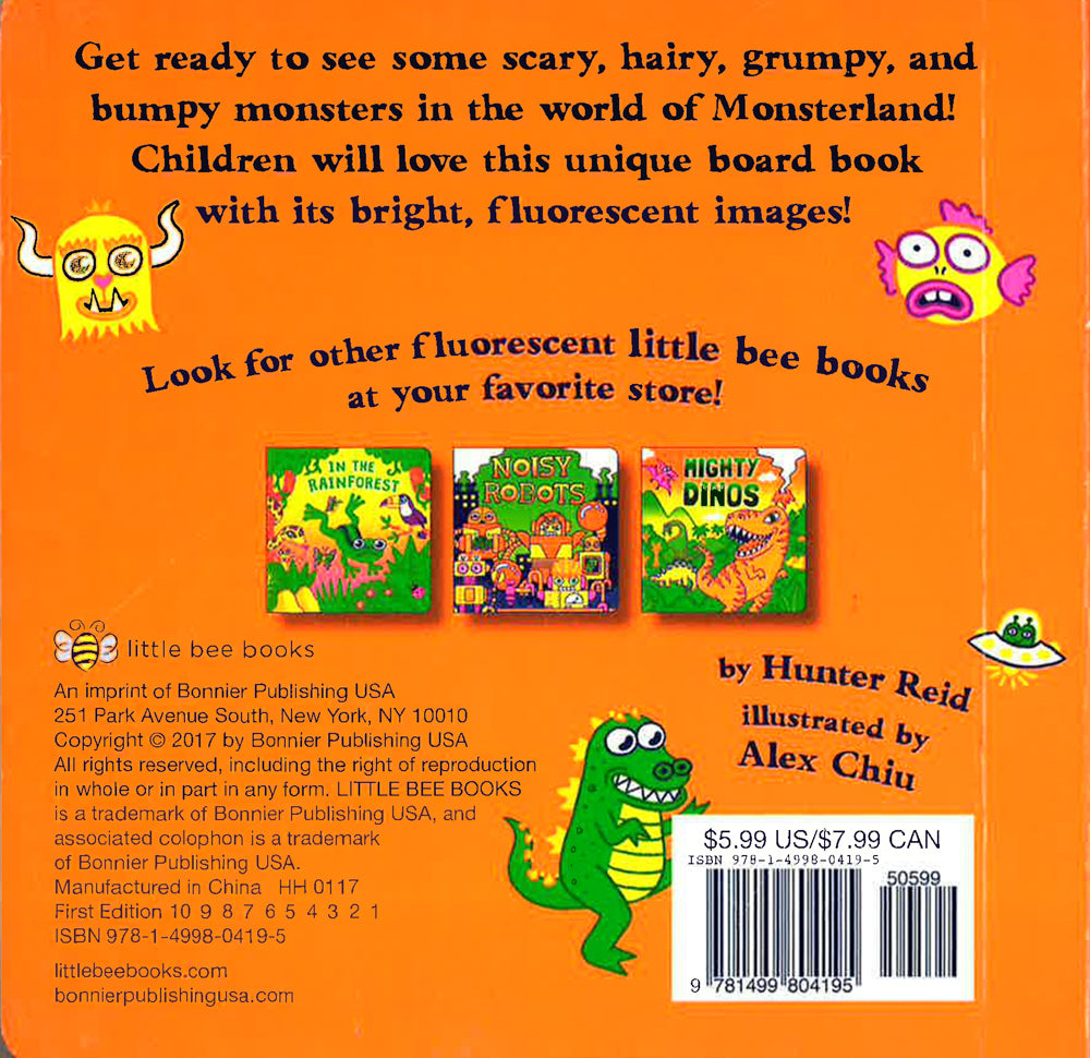 A unique board book with bright, fluorescent images of all sorts of monsters!It's time to visit Monsterland! There are many different kids of monsters featured in this book, including scary ones, hairy ones, grumpy ones, bumpy ones, and much more! The scenes are accompanied by simple, descriptive phrases on each page. With bright, fluorescent colors, this book is sure to catch children's and parents' eyes!